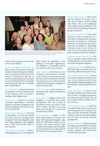 records. Her two grown sons are also in the music industry. nancy zellerbach boschwitz ’72 Nancy lives in San Francisco with her husband, David, and has two children who are currently enrolled at the University of Pennsylvania. She has retired from practicing law and currently serves on the board of four non-profits which frequently take her to Philadelphia, PA and Hawaii. leslie callan ’72 Leslie has had various positions in financial services, lives in San Francisco, and is currently a member of the Dolphin Club. nancy caton ’72 Nancy is a contract consultant specializing in business analysis and project management. She and her husband and 10-year-old son live in the East Bay. anne kilduff chrisler 72’ Ann lives in Sacramento, CA with her huband of 30 years. She is an oncology nurse navigator. She has two daughters, both are college graduates. One daughter lives in New York and the other in San Francisco. anne “kelny” denebein ’72 Kelny is a Managing Director at First Republic