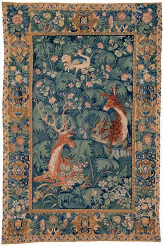 Large-leaf verdure depicting a stag and doe. Southern Netherlands, 1550–1600. Wool and silk, 270 by 178 cm.
