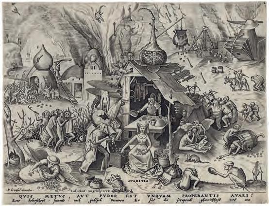 Avarice, by Pieter van der Heyden (c.1530–72) after Pieter Bruegel the Elder (c.1525–69). Engraving, 29.6 by 22.5 cm. BELGIAN ANTIQUARIAN BOOKSELLERS ASSOCIATION (BBA), BRUSSELS