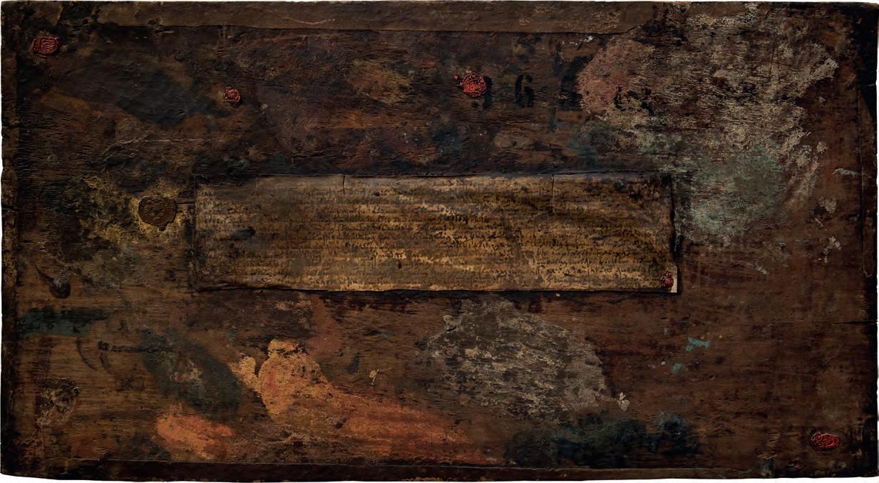 Executed possibly pre 1515. Recorded by Domenico Pino, the author of the first monograph dedicated entirely to Leonardo’s Cenacolo, the Prior of the monastery for which the original Last Supper was made. Written in 1796 as located in the Santa Maria Delle Grazie di Milano and in Guillon as “…l’autre petit, et non moins ancienne, mais peinte sur bois…elle était au temps du P. Pino dans le chambre de l’un de ses confreres”. Imperial seal of the royal academy, Milan. Christies London June 7 1856 as Lionardo da Vinci.. Gift of John Law to St Wilfrid’s Convent. The reverse with ancient parchment (papal bull?) and numerous wax seals. 36 cm x 65 cm. £20,000-30,000