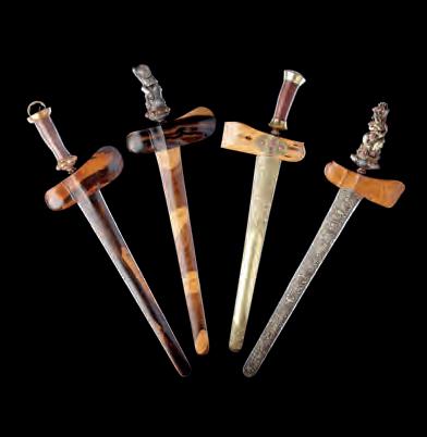 Four keris daggers. 19th century, Bali and Lombok. Steel, wood, gilt metals and precious/ semi-precious stones, length each 50–60 cm.