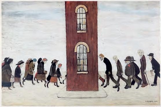 Meeting point, by L.S. Lowry (1887–1976). 1973. Offset lithograph printed in colours on wove, 47 by 71 cm. HIDDEN GALLERY, BATH AND BRISTOL