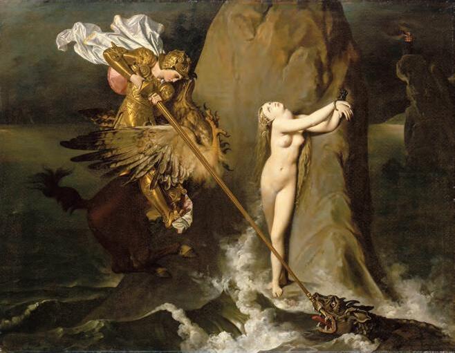 Ingres’s time in Rome was marked by financial insecurity, and the need to sell modest-sized works to private clients explains his excursions into the genre historique and his interpretations of scenes from the Middle Ages and Renaissance. In Roger rescuing Angelica (no.46; Fig.96), a government commission exhibited at the 1819 Salon, Ariosto’s tale gave Ingres the opportunity to combine medieval visual sources with his own fertile imagination. The result was a disconcerting hybrid of hyper-realism and fantasy that puzzled and upset many critics. The largescale rectangular original is paired with the much smaller oval canvas produced over two