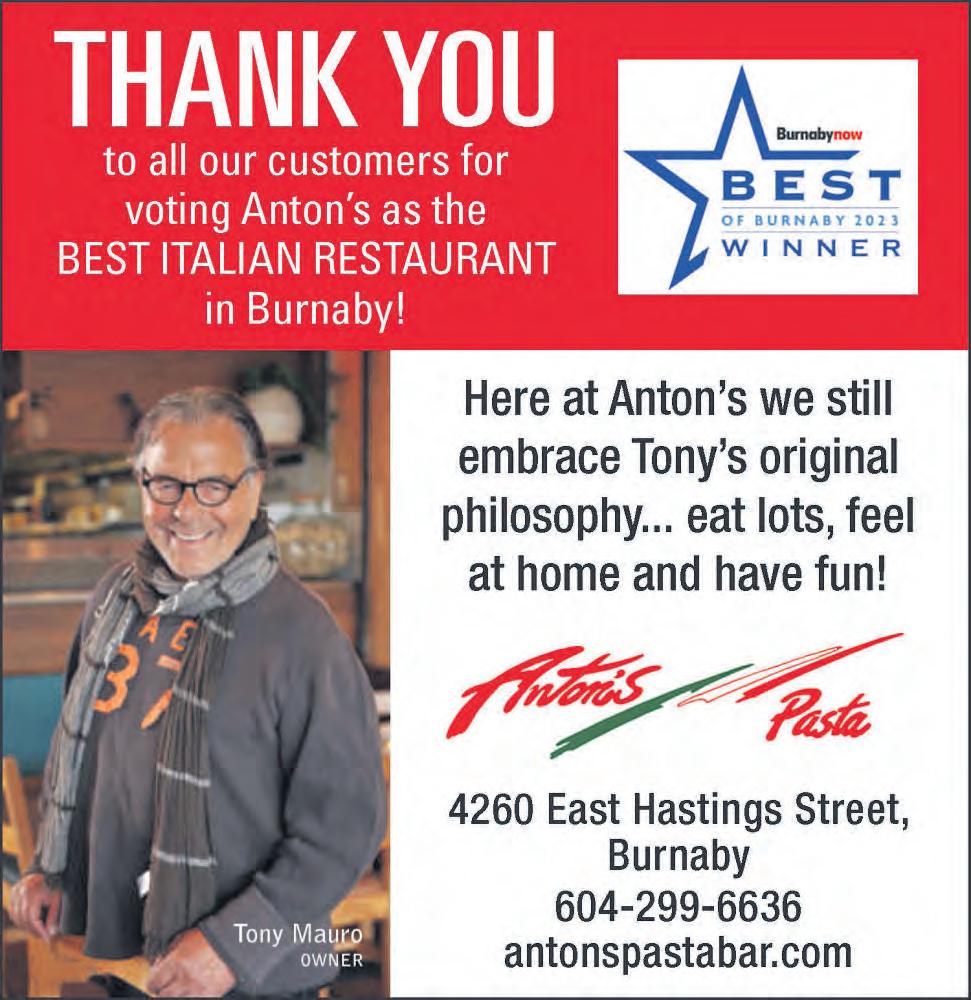 BurnabyNow • THURSDAY,April 27,2023 B23 4142,4150&4156HastingsSt, Burnaby 604.291.9373 www.cioffisgroup.com THANKYOU TOALLOURCUSTOMERSFORYOURVOTES! Wearehonouredtobevoted BURNABY’SBESTDELI&BESTBUTCHERMEATSHOP! MeatMarket+Deli+Cucina OFBURNABY2023 WINNER