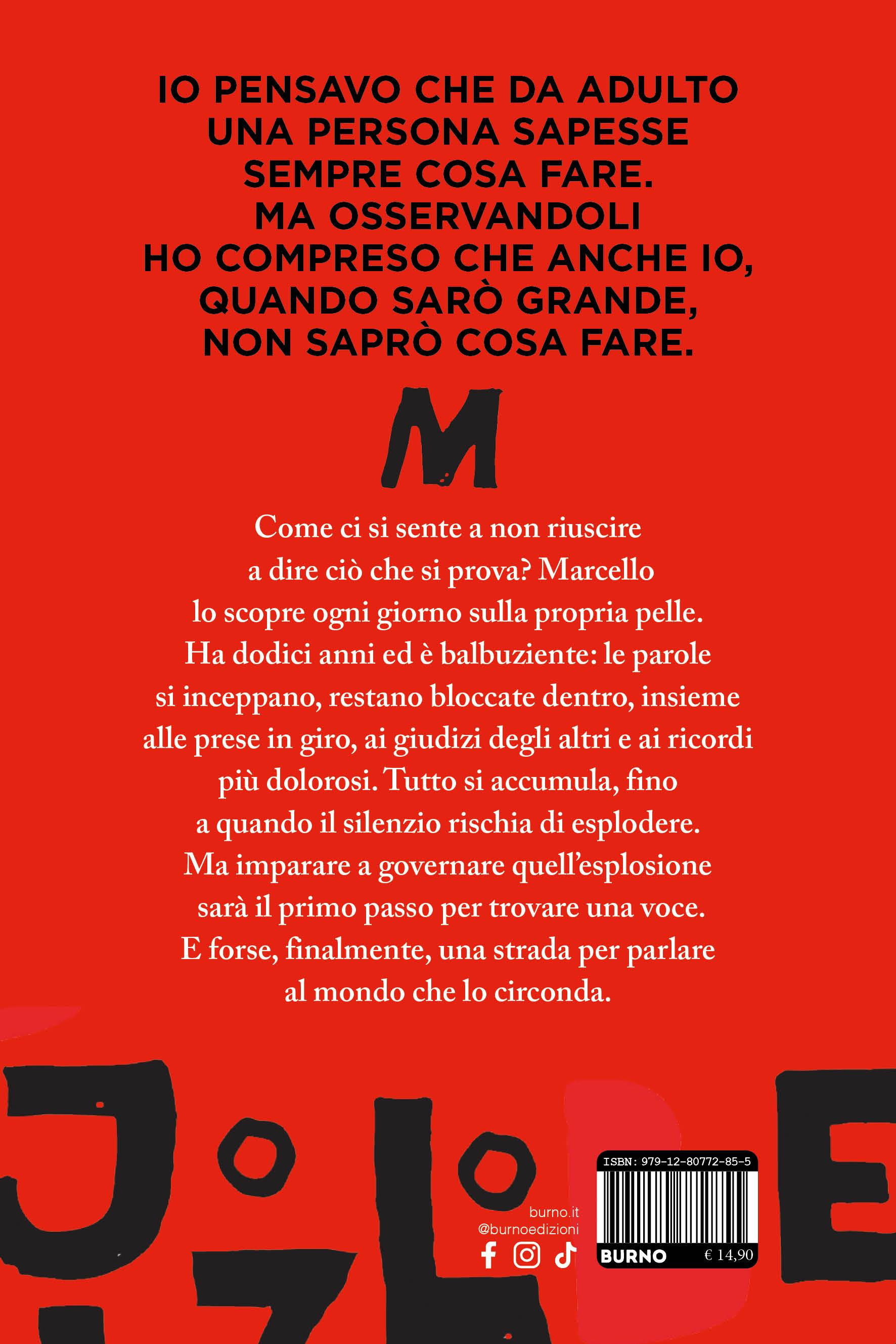 I miei compagni, che di solito non sembrano essere molto creativi (visto che parlano solo di calcio e di canzoni trap), diventano improvvisamente originali quando si tratta di prendermi di mira. Sono molti i nomi con cui mi chiamano: balbu, tartaglione, Mammarcello, e a volte, semplicemente, ritardato. Il dramma del balbuziente è che non può difendersi in alcun modo. Mi spiego meglio. Il mio amico Leo (quello della nonna smemorata) è parecchio grasso, ma quando gli danno del ciccione o della palla di lardo lui riesce sempre a rispondere a tono, e a volte si prende anche delle belle soddisfazioni. Io, se provo a rispondere, peggioro la situazione: le parole mi rimangono in gola, e mi tocca ingoiarle, e poi mi bruciano, e io darei tutta la mia collezione di Lego per essere grasso ma bravo a parlare.