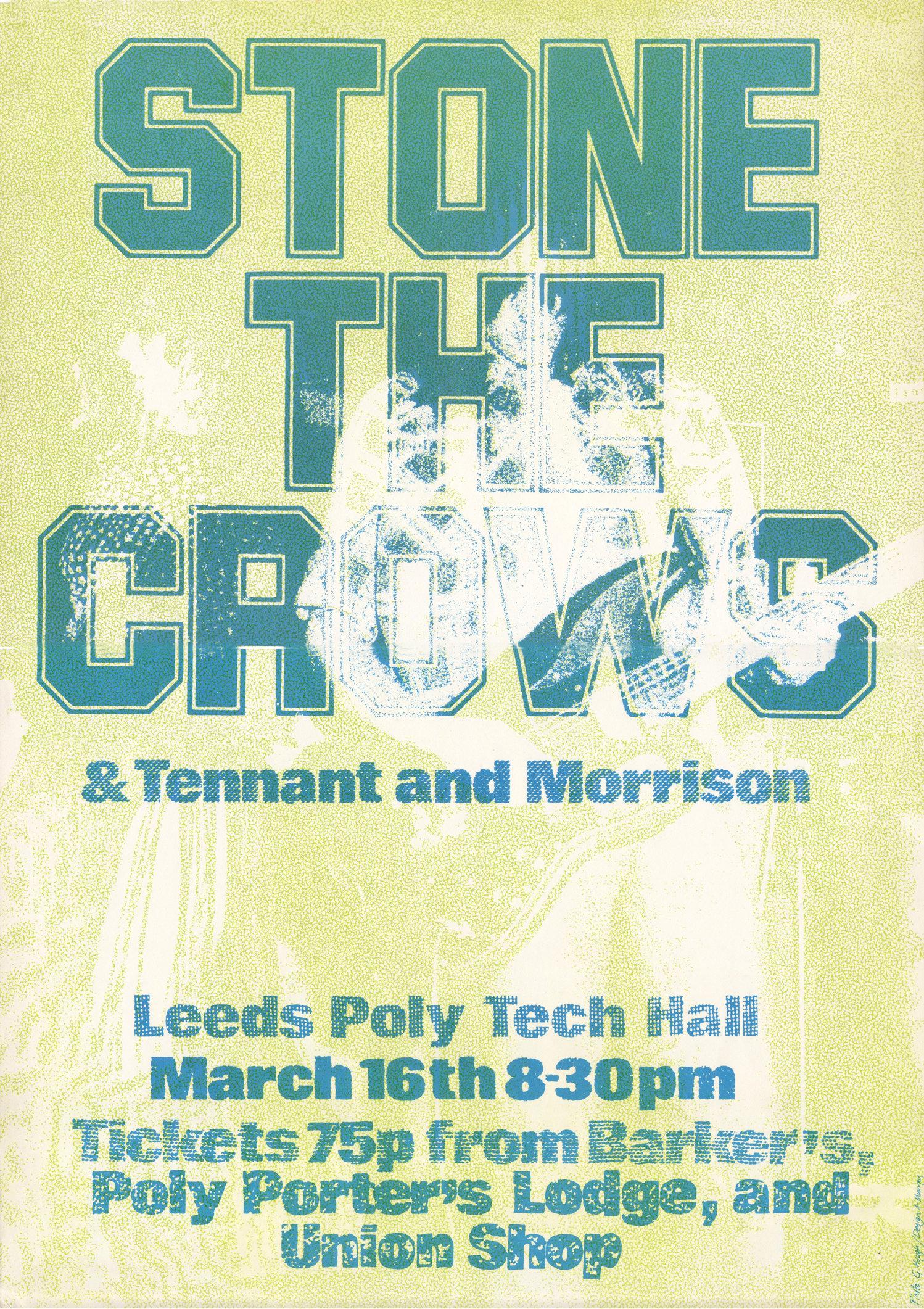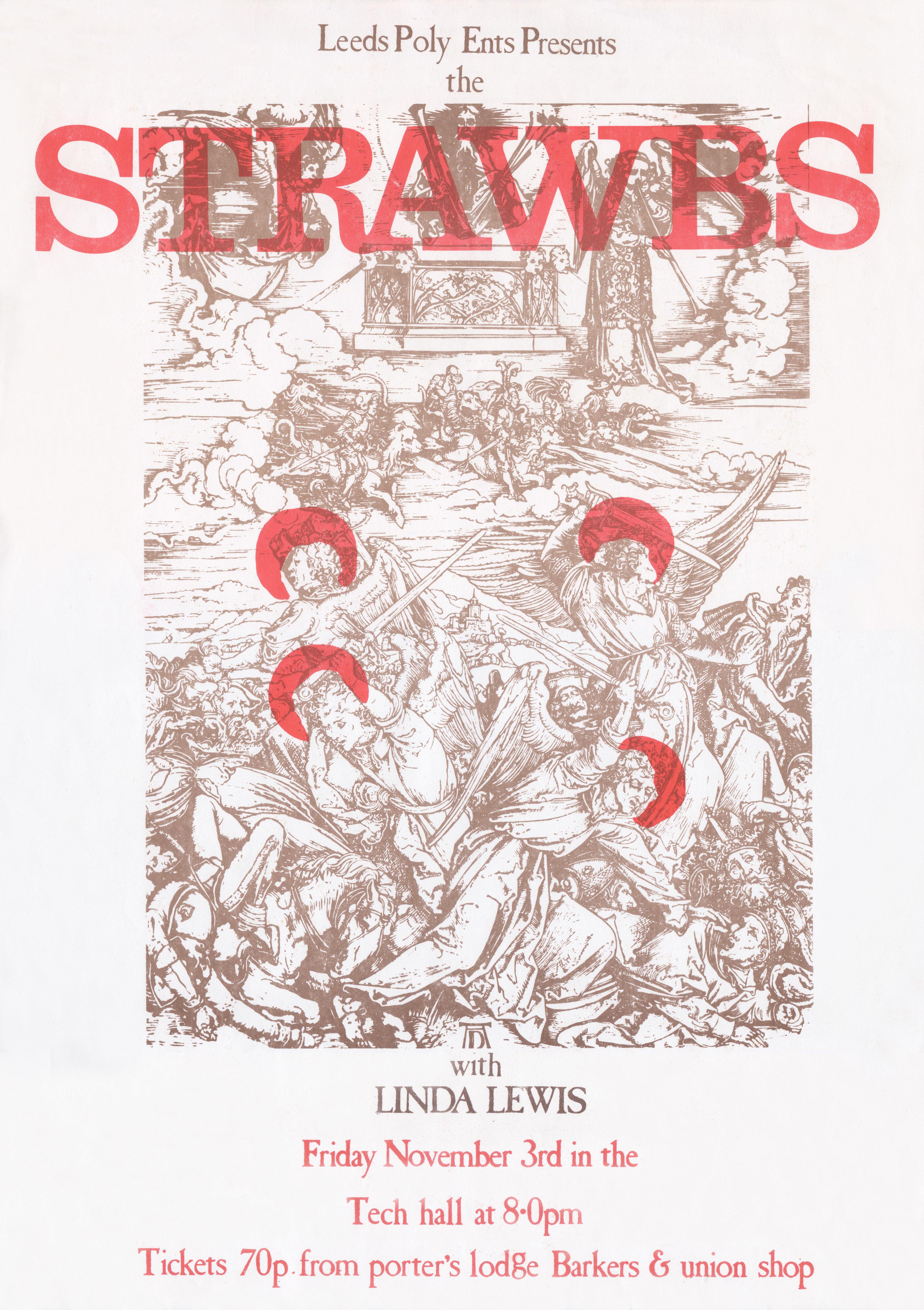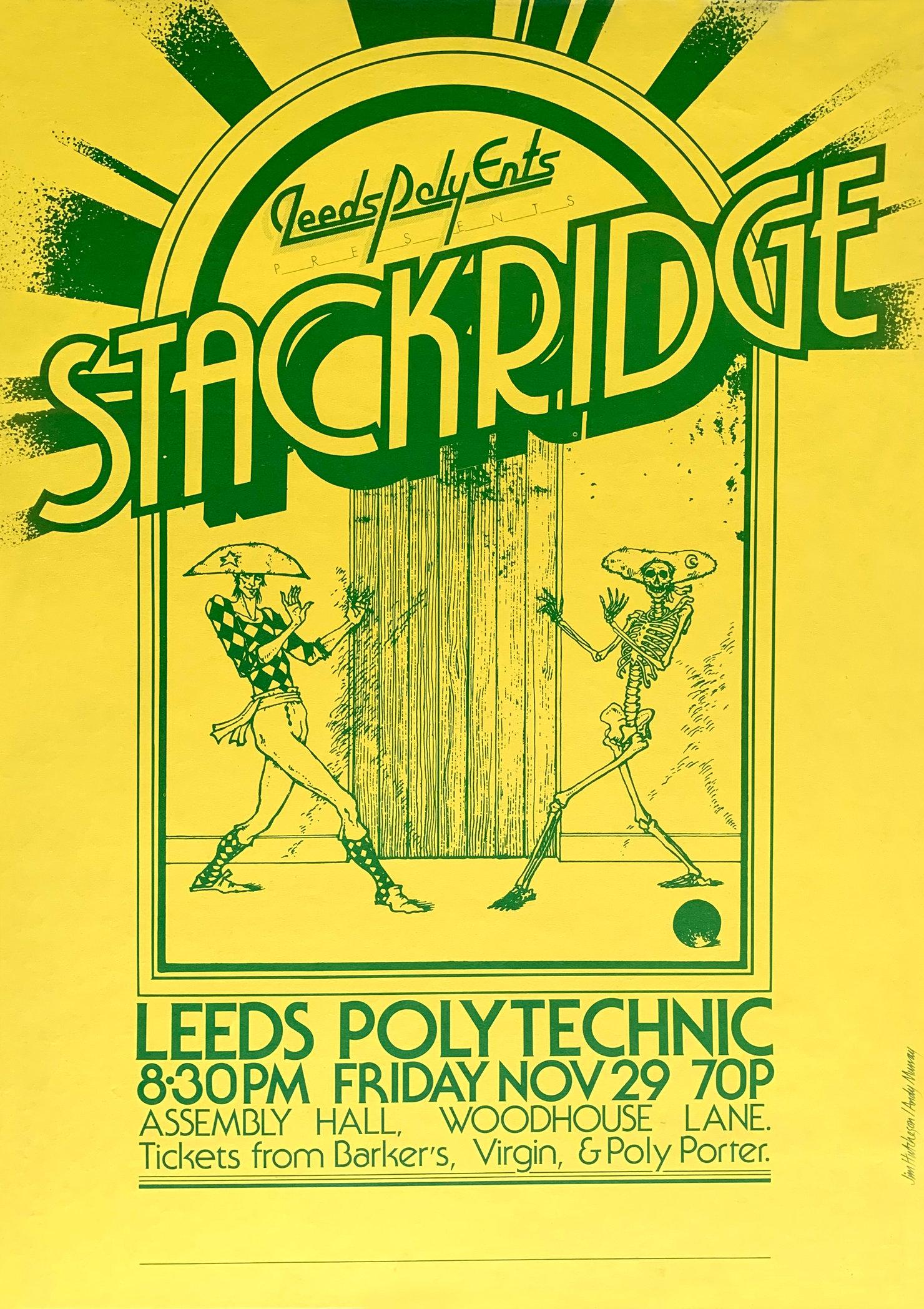 I was studying graphic design, which they called ‘Communication Design’, at Leeds Polytechnic (now Leeds Beckett University) from 1971 to1975. As a huge music fan, I thought the advertising for the shows that the Poly put on could be improved. The posters were A4 designs, done by the printer, so I offered to supply art from myself and fellow students for nothing, on the basis that we could have larger, 2-colour posters.