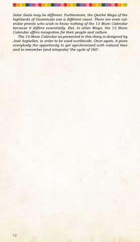 Solar Seals may be different. Furthermore, the Quiché Maya of the highlands of Guatemala use a different count. There are even calendar priests who wish to know nothing of the 13 Moon Calendar because it differs essentially. But, to other Maya, the 13 Moon Calendar offers recognition for their people and culture. The 13-Moon Calendar as presented in this diary is designed by José Argüelles, in order to be used worldwide. Once again, it gives everybody the opportunity to get synchronized with natural time and to remember (and integrate) ‘the cycle of 260’.