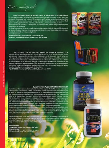Alive Ultra Potency Woman’s 50+ en Alive Women’s ultra potency De vitamine complexen van Alive zijn vervaardigd uit plantaardige materialen, en deze twee nieuwe blends zijn speciaal voor vrouwen. De producent geeft aan dat ze een hoogwaardige MultiVitamine en volledige voeding energie booster zijn. Ze bevatten onder meer 26 groenten en fruit, groene voeding, paddenstoelen enzymen, antioxidanten, Luteine, Resveratrol, en meer. Alive! Women’s Ultra Potency is samengesteld uit voedingsstoffen je meer energie en welbevinden geven, aldus de producent. De Ultra Potency voor 50+ bevat extra B-vitaminen voor energie, 1,000 IU vitamine D3, plantaardige calcium. De Multi vitamines zijn zo samengesteld dat je als vrouw binnenkrijgt wat het lichaam in de desbetreffende levensfase nodig heeft. www.vitacost.com Alive Women’s ultra potency: Prijs € 32.00 Code: ALIVW Alive Ultra Potency Woman’s 50+: Prijs € 27.50 Code: ALWHW