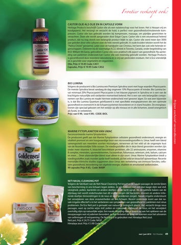 Frontier verkoopt ook: Castor Olie als olie en in capsule vorm Heritage Products beschrijft Castor olie als een nalatenschap voor het leven. Het is Hexaan vrij en koudgeperst. Het verzorgt en verzacht de huid, is perfect voor gezondheidsstimulerende kompressen. Castor olie kan gebruikt worden bij kompressen, massage, om pijnlijke gewrichten te verzachten. Deze olie wordt aangeraden door Edgar Cayce. Castor olie is een eeuwenoud helend product, dat nu nog steeds een belangrijk product blijkt te zijn. Castor olie werd meer dan 3000 jaar geleden door vele culturen over de hele wereld gebruikt. In oude kruiden teksten wordt het de “Palma Christi” genoemd, Latijn voor de handpalm van Christus, het kent dan ook vele helende eigenschappen. Doktoren bij de voormalige A.C.E. kliniek in Toronto, Canada, onder begeleiding van M.D. William McGarey, gebruikten Castor olie voor praktisch elk aspect van gezondheid. Na aanleiding van patiënten onderzoek kan Castor olie ook inwendig gebruikt worden. Heritage Products is gecertificeerd door meerdere laboratoria en is vrij van pesticiden residuen. Het is Eco vriendelijk en is geschikt voor vegetariërs en veganisten. Olie, Prijs: € 10.45 Code: CAS1 Capsules, Prijs: € 19.95 Code: CAS2