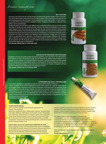 complex | Grapefruit seed extract | Aloë dent tandpasta | Zeoliet | Samento | Banderol | Cumanda | Magnesium Chloride | Noni sap | Black Krachai | Pearlcium | Pinhole Readers | Moldaviet stenen | Kristallen schedels | Adya Clarity water | Coca thee | Cayenne peper en nog veel meer! N.B: Volgens Europese wetgeving mogen in informatie over voedingssupplementen geen specifieke ziekten worden genoemd, waarvoor de middelen een genezende werking zouden hebben. Deze productenbeschrijvingen hebben geen intentie om een diagnose te stellen, te behandelen of wat voor ziekte dan ook wonderbaarlijk te genezen. We richten ons op preventie, voorkomen is namelijk ten alle tijden beter dan genezen. Raadpleeg bij ernstige aandoeningen altijd eerst uw arts of therapeut. Prijzen zijn vermeld in euro’s en kunnen in de loop van het jaar aangepast worden. Frontier Magazine 2013