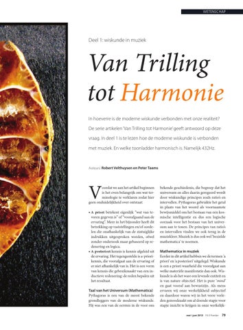 Van Trilling tot Harmonie In hoeverre is de moderne wiskunde verbonden met onze realiteit? De serie artikelen ‘Van Trilling tot Harmonie’ geeft antwoord op deze vraag. In deel 1 is te lezen hoe de moderne wiskunde is verbonden met muziek. En welke toonladder harmonisch is. Namelijk 432Hz.