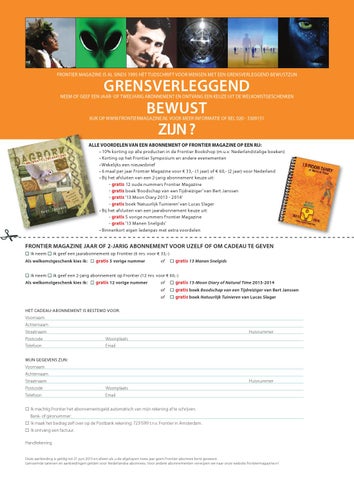 alle Voordelen van een abonnement op Frontier Magazine op een rij: • 10% korting op alle producten in de Frontier Bookshop (m.u.v. Nederlandstalige boeken) • Korting op het Frontier Symposium en andere evenementen • Wekelijks een nieuwsbrief • 6 maal per jaar Frontier Magazine voor € 33,- (1 jaar) of € 60,- (2 jaar) voor Nederland • Bij het afsluiten van een 2-jarig abonnement keuze uit: - gratis 12 oude nummers Frontier Magazine - gratis boek ‘Boodschap van een Tijdreiziger’ van Bert Janssen - gratis ‘13 Moon Diary 2013 - 2014’ - gratis boek ‘Natuurlijk Tuinieren’ van Lucas Slager • Bij het afsluiten van een jaarabonnement keuze uit: - gratis 5 vorige nummers Frontier Magazine - gratis ‘13 Manen Snelgids’ • Binnenkort eigen ledenpas met extra voordelen