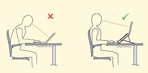 Leg documenten, je tablet of smartphone op een licht hellend vlak tussen scherm en toetsenbord en dat alles op één lijn. Dit om goed te kunnen lezen zonder je nek te buigen. Zo verlicht je de spanning op je nek en schouders.