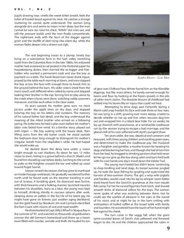 Sandra Kleven - Lone Man of gear over Chilkoot Pass. Winter found him on the Klondike diggings, but like most others, he barely earned enough for beans and flour by hacking at the frozen gravels in the pits of other men’s claims. The desolate lessons of childhood had settled into his bones like an injury that could not heal. Attempting to drive dogs past Fortymile during a March cold snap frostbit his face and took three or four toes. He was lying in a drift, growing ever more sleepy, unable to decide whether to rise up and live, when rescuers dug him out and wrapped him in a black bear hide. For six weeks, he lay up, feverish with pneumonia, at a ramshackle roadhouse run by the woman trying to escape a bad marriage, and the glacial chill at his core softened with April’s pungent thaw. Ten years older, she was, skeptical and careworn and heavyset, with three young children and startling green eyes, and determined to make the roadhouse pay. Her husband was a freighter and gambler, a musher known for beating his dogs and blackening her face, and though she had driven him from her bed, he bragged to drinking partners that he’d never let her go nor give up the low-slung cabin and barn he’d built with his own hands one day’s travel down the Valdez Trail. The young man healed but didn’t leave, continuing to chop kindling and tend dogs. As boreal summer jungled up, he took the boys fishing for grayling and supervised the harvest of late-summer chums. The girl, a wisp with pigtails and freckles, would crawl into his lap to whisper raven fables she’d heard from the Gwich’in grandmas at the river-mouth fish camp. For her he carved figurines from birch, and shaved smooth sticks of diamond willow for the boys. The woman never spoke of what was evolving between them, but he could see the sparkle of pleasure in her eyes at the sound of his voice, and at night he lay in the barn smiling with anticipation of boiled coffee at the broad table with family and boarders. He wondered how the touch of her hand might feel against his cheek. The turn came in the soggy fall, when the giant spine-covered leaves of Devil’s club yellowed and fireweed began to die. He and the children approached the cabin in
