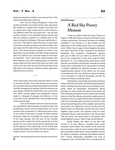 A Red Sky Poetry Memoir I made my debut at Red Sky Poetry Theater on August 5, 1989, after almost two years of seeing the name on flyers around town. The reason the date is so indelibly imbedded in my memory is it also marked my first appearance in the Sunday Seattle Times as a contributor to the “What’s Funny” page in Pacific Magazine. My piece was called “Tips From Temps,” a parody of the etiquette pamphlets that temporary employment agencies gave you to make sure you didn’t go berserk the first day of your assignment at some fancy high-rise office downtown. So, I was feeling pretty good about myself that day. I was 30 years old, and after a decade of moving slowly north up the West Coast I had started to develop a complex regarding the disparity between my nearmegalomaniacal opinion of my talents and my actual accomplishments. But now, all that was going to change. I was a Humorist in a Big City Newspaper, just like my heroes Don Marquis and Ring Lardner. Nonetheless, I was already worried about being a sellout, what with writing for a family-friendly publication where I would be forced to self-censor my deepest avantgarde, epater les bourgeoisie, revolutionary literary principles. In order to keep this aspect of my artistic self from withering and dying, the time seemed ripe to finally check out Red Sky. Merely entering the seedy portals of Squid Row Tavern on Capitol Hill served to metaphorically wash the accumulated grime of years of exposure to the compromise and hypocrisy of the capitalist system off my true essence. As I signed my name to the open mike list, Marion Kimes, the diminutive, rail-thin MC with a blond pageboy, Texas accent, and cigarette never far away, exclaimed “Did you write that article in the Times today? That was funny.” No doubt about it, the planets were clearly aligned on Aug. 5, 1989 to make me feel Special. Beside Marion, the elders of my new tribe seemed to be Don Wilsun, a bearded, burly, goodnaturedly macho fellow who looked all the world like the construction worker he was in real life, Robin Schultz, who resembled a taller, leaner version of Robert Crumb’s Mr. Natural, margareta waterman and Roberto Valenza, who I found, respectively, standoffish and scary. In margareta’s case, I decided after time it was because she