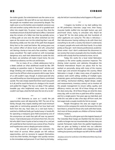 CIRQUE why the hell am I worried about what happens in fifty years? *** I imagine my brother or my dad walking into an HR preliminary interview. Large men, their heavy, muscular builds stuffed into too-tight button ups and pinch-toed shoes, trying to articulate why they’d be a “great fit!” for the desk jockey job that hundreds of other applicants are vying for. The idea is ridiculous— that ridiculousness having nothing to do with them but everything to do with a society that doesn’t understand, or respect, people who work with their hands. I’m as desk jockey as they get—tech industry professional, academiadriven writer—but I don’t understand the disconnect in our society that sneers at people who live, breathe, build, and do with a body that has evolved to move, not sit. Today, Eric works for a local metal fabrication company as the senior quality assurance inspector. The shining metal counters and cabinetry throughout the Portland International Airport are pieces that he has worked on personally, along with many of the massive metal signs and artwork throughout the country. Metal fabrication is tough, it takes many areas of expertise to produce work worth selling: welding of multiple types (materials, gases, and techniques), press operation, cutting and lathing, mechanical drafting, digital design, angles and measurements, inventory control, not to mention all the people management to ensure safety, quality, and efficiency metrics are met. All of these things are what Eric does every day. All of these things are what Eric does every day, with no sick time or paid time off for vacation, and he’s a single parent. Two years ago our dad died, and while Eric was able to take a few days off from work, the lost wages took a couple months for him to recover. People throughout the area are eager to get hired on at the company Eric works for because this is the best there is, at least for those who work with their hands. And most of those people are children of former lumber industry workers. Those of us who grew up in the majestic beauty of The Columbia River Gorge are thankful that the clear-cut swaths no longer mar our mountainsides, but too many are scarred. Permanent marks from the painful hopelessness that we grew up feeling is etched into our collective psyche. Our parents’ livelihoods were stripped away and nothing but poverty and despair was left to fill the void. 2nd place winner for nonfiction in the Willamette Writers Kay Snow writing contest.