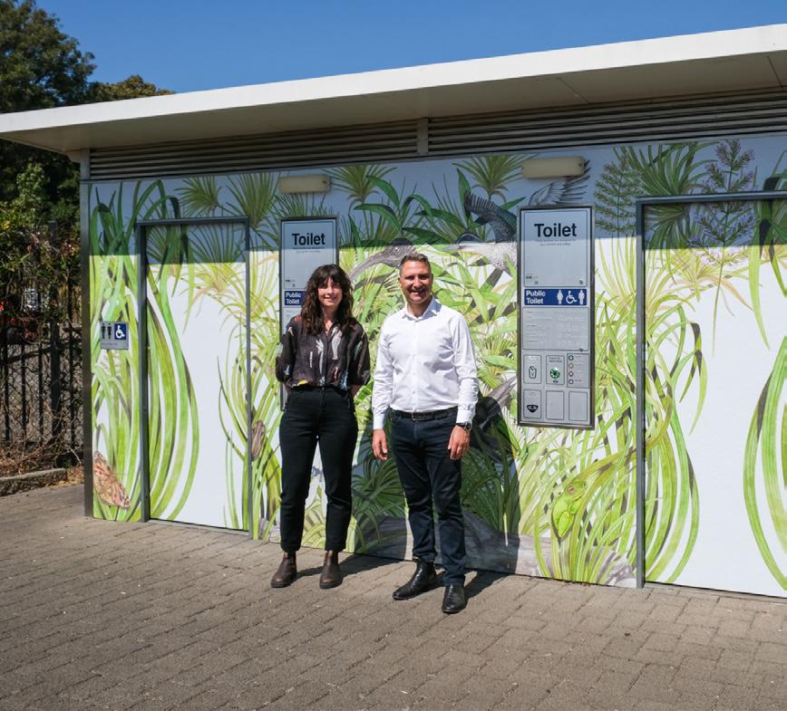 当地艺术家塔利亚-凯特-亨德森(Tahlia Kate Henderson)和市长法克(Faker)站在旺格尔公 园的 “旺格尔湿地 “艺术作品旁。