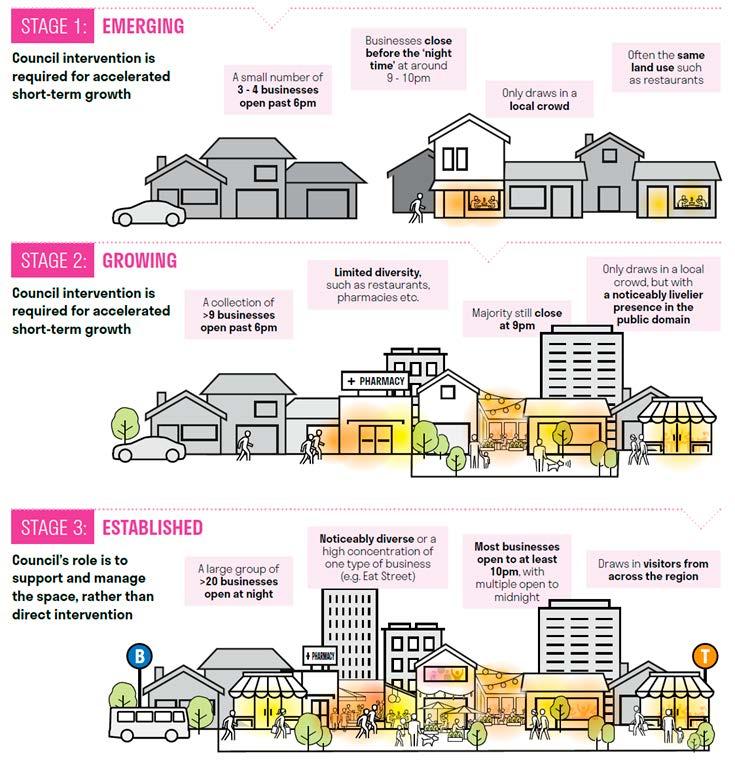 The primary driver of the night time economy are the local businesses that attract an audience to a space. The classifications are heavily linked to the number of late night businesses that define both the activity and attraction to the area. Businesses trading hours and the diversity of offering are a large factor in driving the night time economy. Council, state government and local businesses play a role in the economic activity attribute.