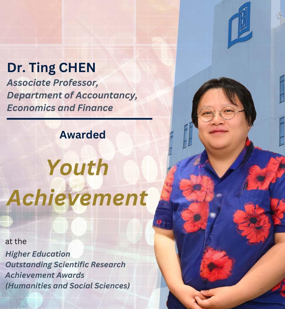 The HKBU School of Business has marked another milestone in the realm of impactful research. The beacon of this achievement, Dr. Ting CHEN, Associate Professor and Associate Head (Research) of the Department of Accountancy, Economics and Finance, has been bestowed with the prestigious Youth Achievement (Hong Kong and Macao) Award. This accolade is part of the 9th Higher Education Outstanding Scientific Research Achievement Awards (Humanities and Social Sciences), a distinguished honour conferred by the Ministry of Education (MOE).