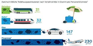 Klimaschonendes Reisen ist oft eine Herausforderung. Dabei ist es eigentlich ganz einfach. Der Reisebus ist das umweltfreundlichste Verkehrsmittel! Mit weniger als einem Liter Treibstoff pro Person auf 100 km und einem CO2-Ausstoß von 32 Gramm pro Personenkilometer liegt der Reisebus in der Klimabilanz nicht nur weit vor dem Flieger und dem PKW, er schneidet auch besser ab als die Bahn. Zudem trägt er zur Verkehrsentlastung bei, indem ein durchschnittlich besetzter Reisebus rund 30 PKW ersetzt. Wählen Sie den umweltfreundlichen Weg und reisen Sie mit uns! busreisen