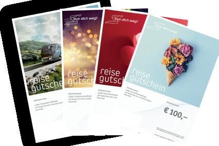 und damit verpflichtet, die Bestimmungen des PRF und der PRV gegenüber den Reisenden einzuhalten, ist der Partner. bus dich weg! betraut den Partner mit der Vermittlung und Verkauf von Reisen und Leistungen, die von bus dich weg! zusammengestellt werden. Der Partner verkauft dem Kunden die Pauschalreiseleistung im eigenen Namen und auf eigene Rechnung, unter sorgfältiger Beachtung der zum Zeitpunkt der Reise gültigen PRG, PRV und AGB unter Zugrundelegung und Beachtung der im Franchisevertrag vereinbarten Grundsätze. Einzelleistungen werden besorgt. Satz und Druckfehler vorbehalten. Die AGB aller Reiseveranstalter der bus dich weg! Gruppe finden Sie unter busdichweg.com/at/service/allgemeine-infos/agb