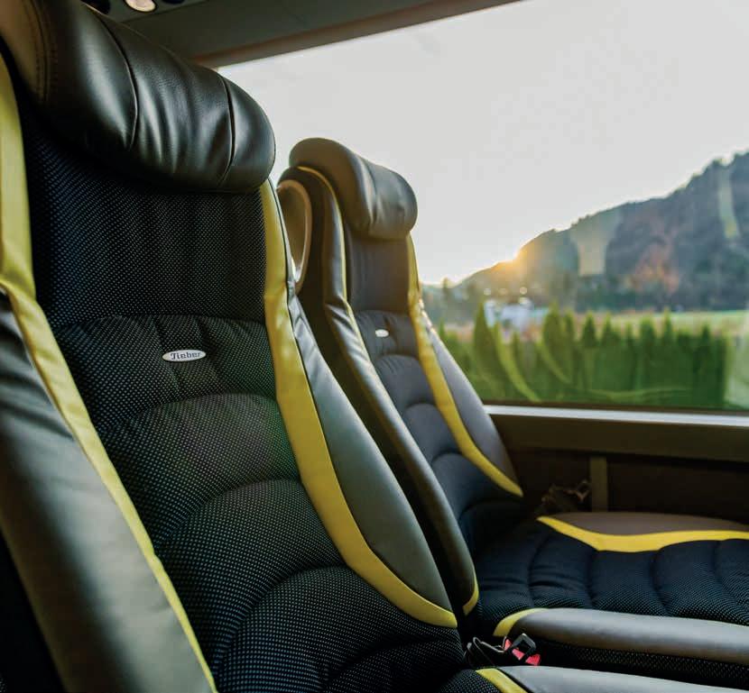 Der Sitzabstand in unseren Luxusbussen ist auf 4* und 5* Niveau und macht somit das Reisen besonders komfortabel. Alle Sitze sind zudem rückwärts und seitlich verstellbar und verfügen über Armlehnen und Fußraster.