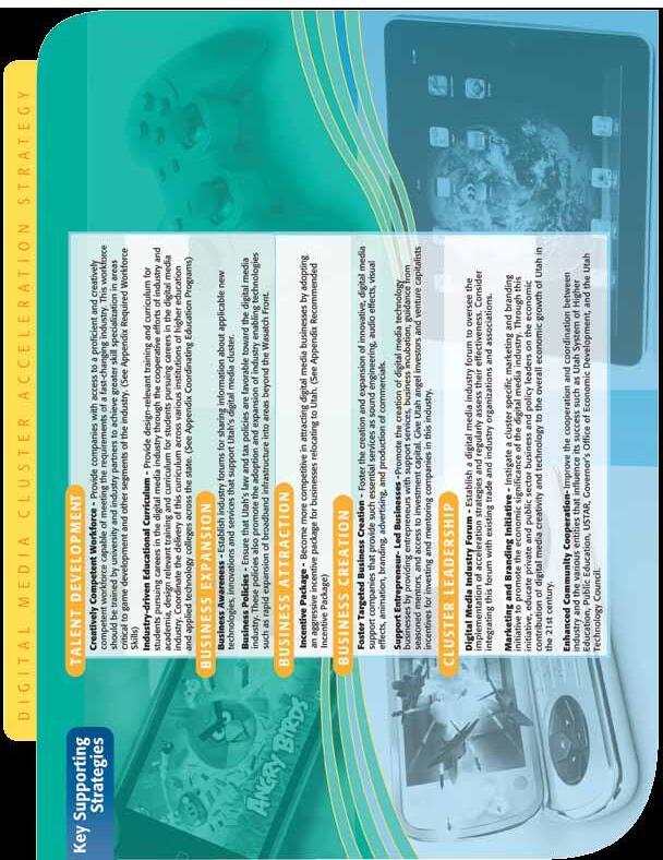 This Utah Digital Media Cluster Acceleration Partnership Strategy incorporates the views, insights and recommendations contributed by a wide spectrum of representatives from industry, academia and the public sector on how best to accelerate the growth of the industry.