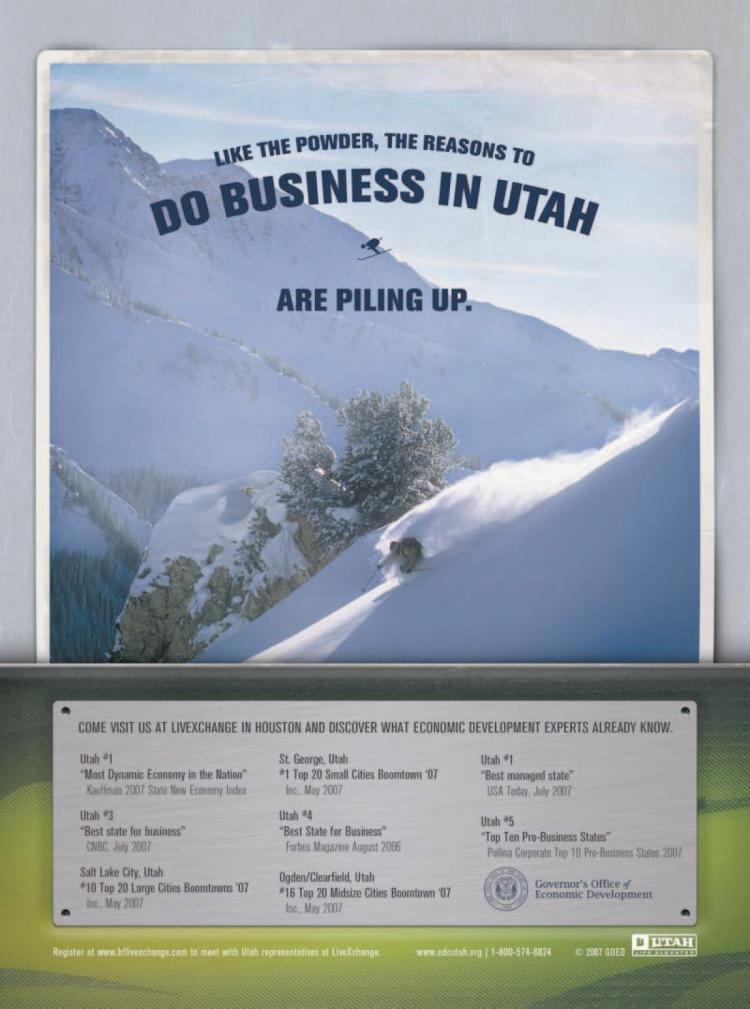 It is a pleasure to present this Annual Report for FY2006-07. Utah is honored by the many accolades being given by leading business media and rating organizations. The Kauffmann Foundation has rated Utah as having the nation’s most “dynamic economy.” Forbes Magazine ranked Utah as the “second best place in the nation to do business.” Many other organizations have recently recognized Utah as a “Top Place for Business,” such as CNBC and the Pollina Corporate Top 10 Pro-business States review. Each ranking demonstrates that Utah has the hottest business economy in the nation.