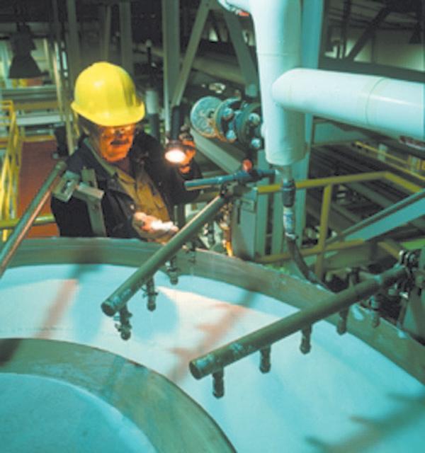 Operator inspects material on a filter table at its manufacturing facility in Cedar City. New, automated controls have added to the safety and efficiency of their processes. American Pacific is a specialty chemical company that produces (i) energetic products used primarily in space flight and defense systems, automotive airbag safety systems and explosives, (ii) Halotron, a clean fire extinguishing agent and (iii) water treatment equipment.