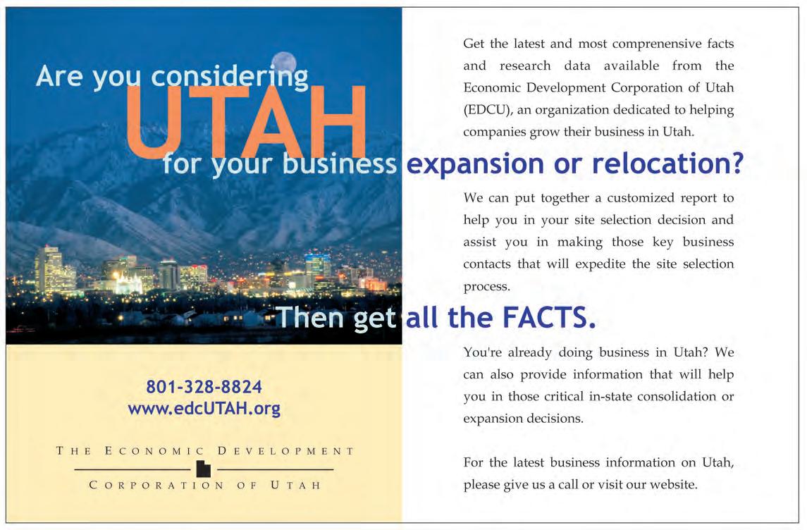 This edition also marks the first time the Utah Facts Book will be published inside the covers of the annual Business Utah publication. The Utah Facts Book answers many of the most common questions businesses ask when considering expanding or relocating to Utah. It is our pleasure to present both of these publications to you.