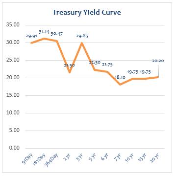 The 91-Day Bill settled at 29.91% p.a from 29.48% p.a. last week whilst the 182-Day Bill settled at 31.14% p.a from 30.05% p.a. last week. The 364-Day Bill settled at 30.47% from 30.03% at last issue. The table and graph below highlight primary market yields at close of the week.