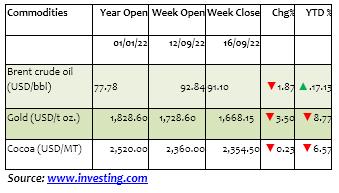 Crude Oil prices edged lower on the week pressured by expectations of weaker global demand and by US dollar strength ahead of possible large increases to interest rates, though supply worries limited the decline. Brent futures traded at US$91.10 a barrel on Friday, compared with US$92.84 at week open. This reflects w/w loss and YTD gain of 1.87% and 17.13% respectively.