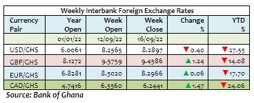The Cedi continued its downward trend against the USD for the week. It traded at GH¢8.2897/$, compared with GH¢8.2565/$ at week open, reflecting w/w and YTD depreciations of 0.40% and 27.55% respectively. This compares with YTD depreciation of 1.64% a year ago.The Cedi however strengthened against the GBP for the week. It traded at GH¢9.4586/£, compared with GH¢9.5759/£ at week open, reflecting w/w gain and YTD depreciation of 1.24% and 14.08% respectively. This compares with YTD depreciation of 2.36% a year ago.