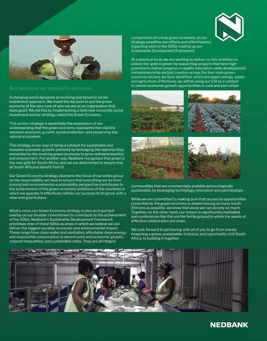 of South Africa’s National Development Plan and the United Nations’ Sustainable Development Goals and supports the South African government in terms of their proposed Nationally Determined Contributions (NDC) emanating from the Paris agreement. Furthermore, it is accredited to the Global Environmental Facility and Green Climate Fund and, in accordance with COP21, supports business innovation and the delivering of sustainable infrastructure solutions to the emerging green economy.