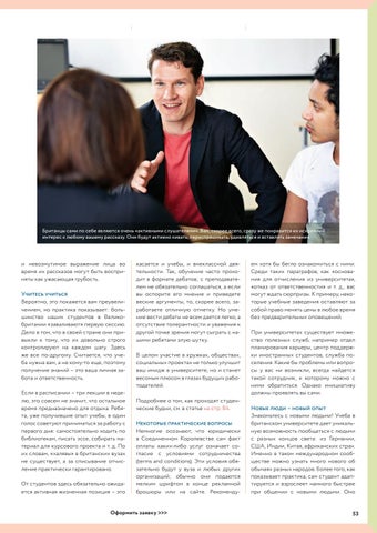 ем хотя бы бегло ознакомиться с ними. Среди таких параграфов, как «основания для отчисления из университета», «отказ от ответственности» и т. д., вас могут ждать сюрпризы. К примеру, некоторые учебные заведения оставляют за собой право менять цены в любое время без предварительных оповещений. При университетах существует множество полезных служб, например отдел планирования карьеры, центр поддержки иностранных студентов, служба поселения. Какие бы проблемы или вопросы у вас ни возникли, всегда найдется такой сотрудник, к которому можно с ними обратиться. Однако инициативу должны проявлять вы сами. Новые люди – новый опыт Знакомьтесь с новыми людьми! Учеба в британском университете дает уникальную возможность пообщаться с людьми с разных концов света: из Германии, США, Индии, Китая, африканских стран. Именно в таком международном сообществе можно узнать много нового об обычаях разных народов. Более того, как показывает практика, сам студент адаптируется и взрослеет намного быстрее при общении с новыми людьми. Оно 53