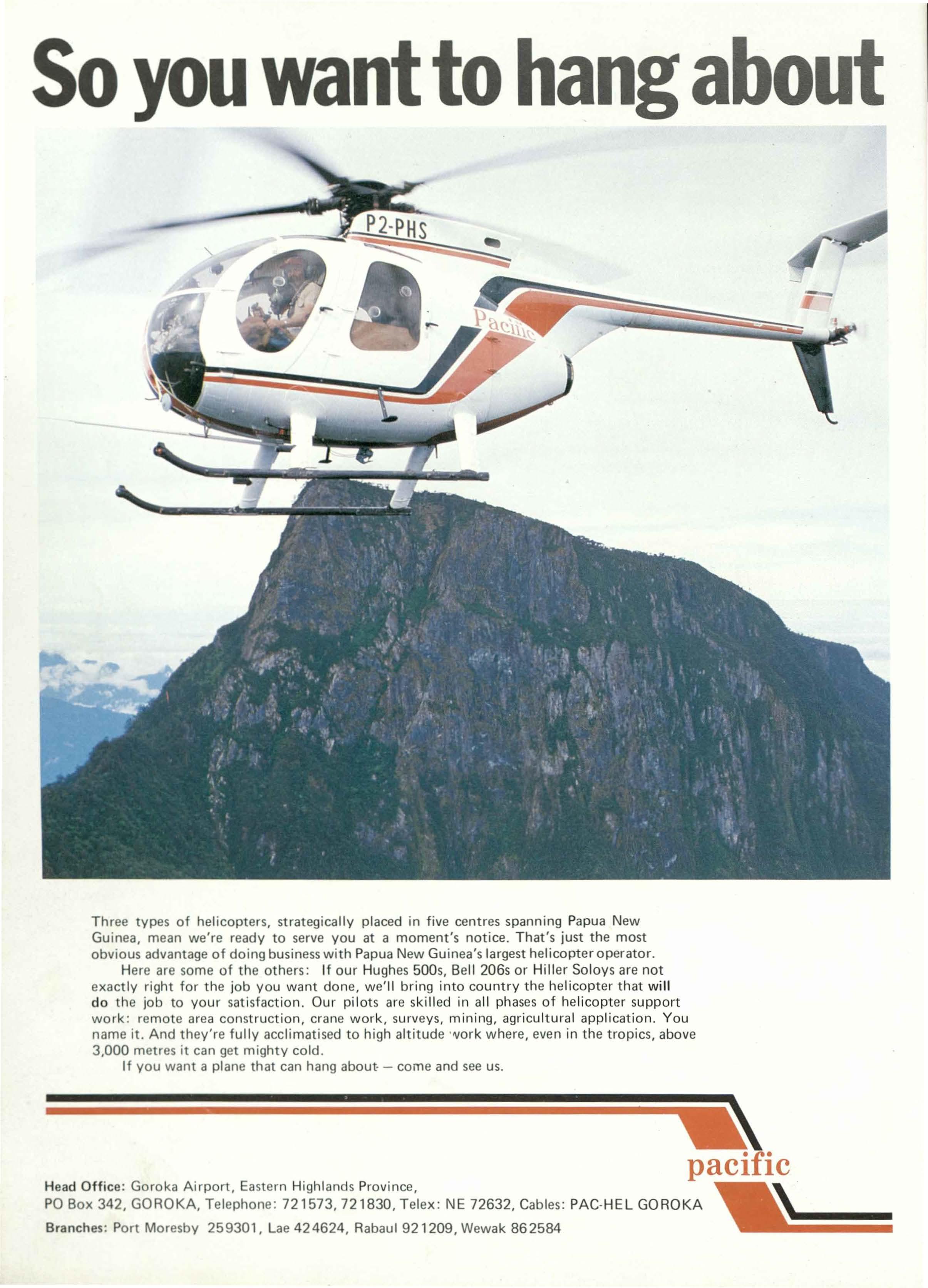 Here are some of the others: If our Hughes 500s, Bell 206s or Hiller Soloys are not exactly right for the job you want done, we'll bring into country the helicopter that will do the job to your satisfaction. Our pilots are skilled in all phases of helicopter support work: remote area construction, crane work, surveys, mining, agricultural application. You name it. And they're fully acclimatised to high altitude ·ivork where, even in the tropics, above 3,000 metres it can get mighty cold.