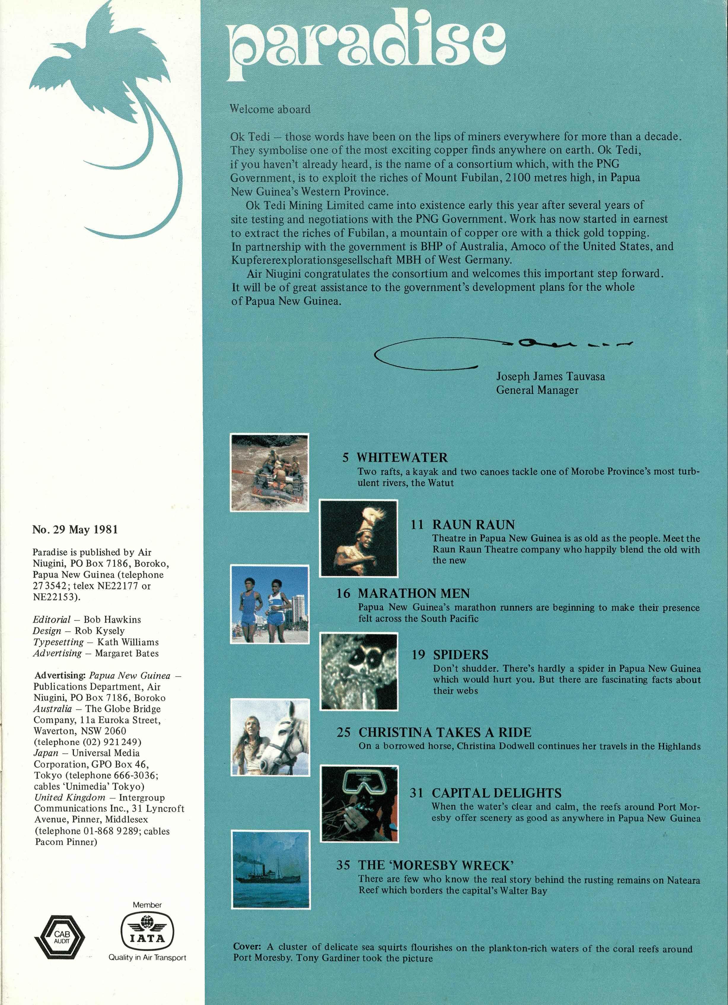 Paradise is published by Air Niugini, PO Box 7186, Boroko, Papua New Guinea (telephone 273542; telex NE22177 or NE22153).