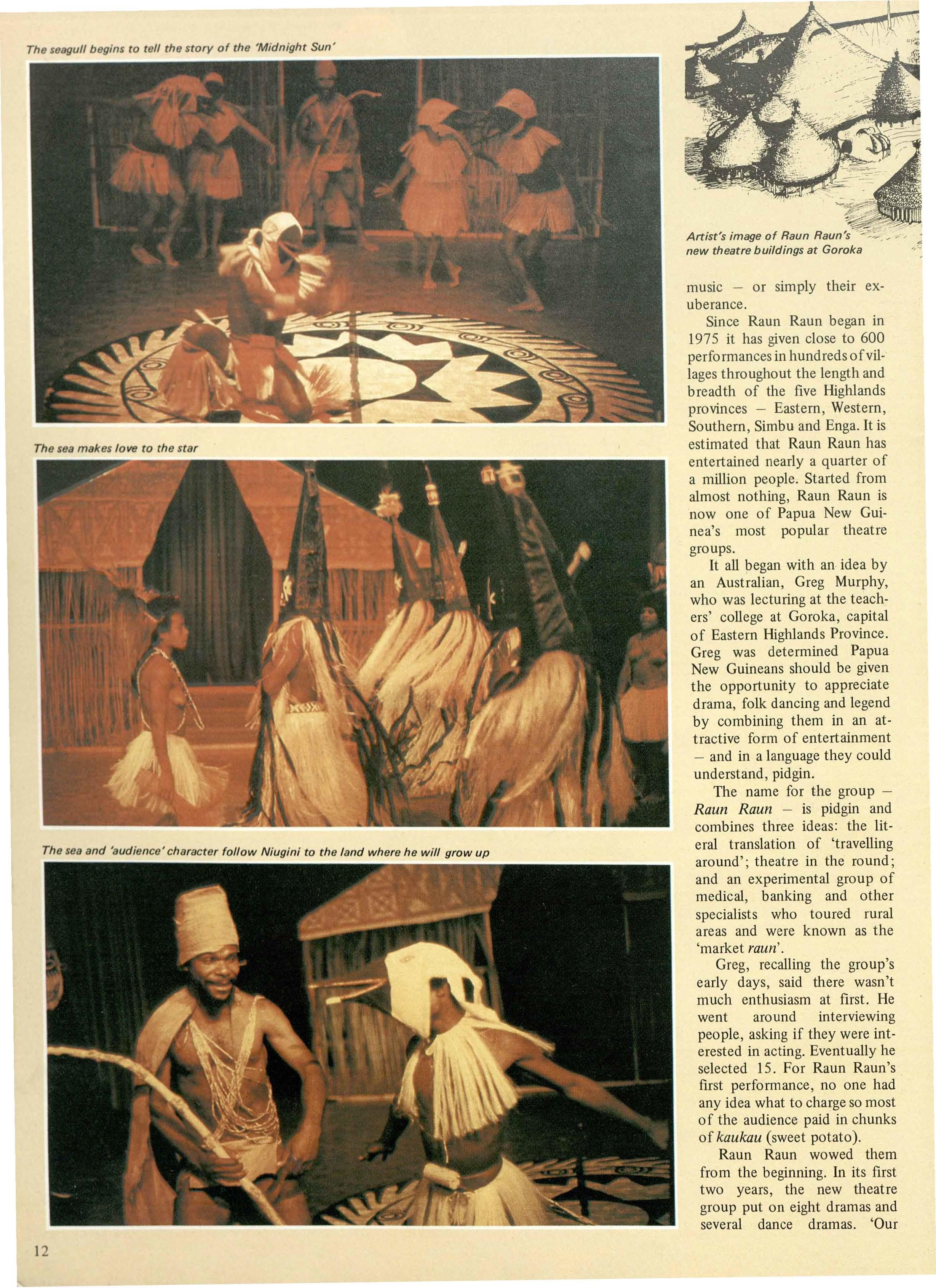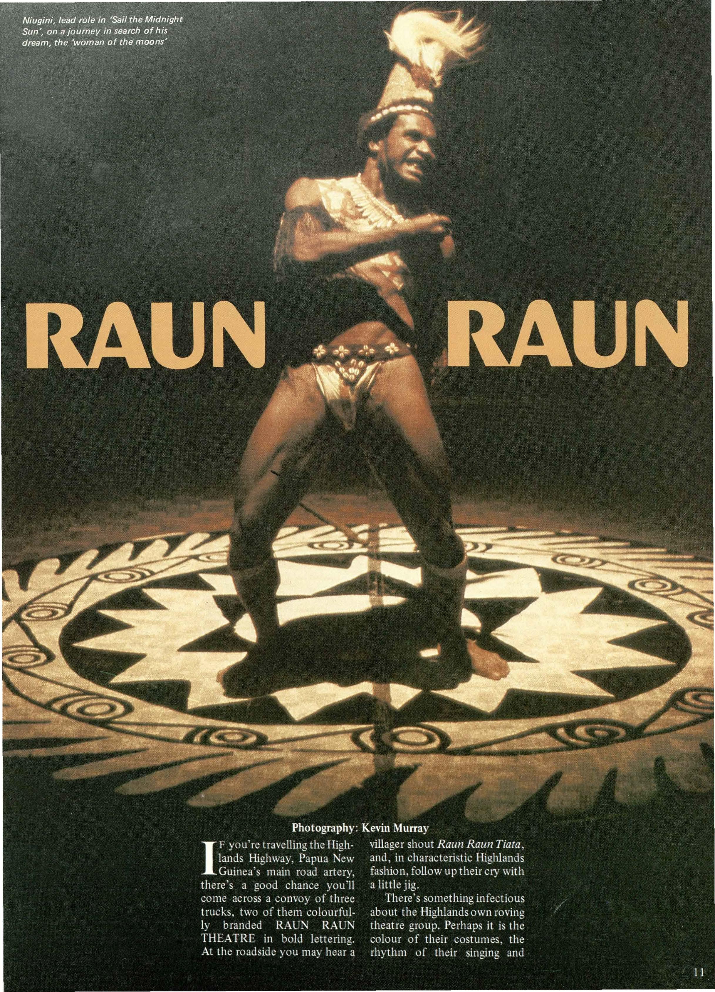 Since Raun Raun began in 197 5 it has given close to 600 performances in hundreds of villages throughout the length and breadth of the five Highlands provinces - Eastern, Western, Southern, Simbu and Enga. lt is estimated that Raun Raun has entertained nearly a quarter of a million people. Started from almost nothing, Raun Raun is now one of Papua New Guinea's most popular theatre groups.