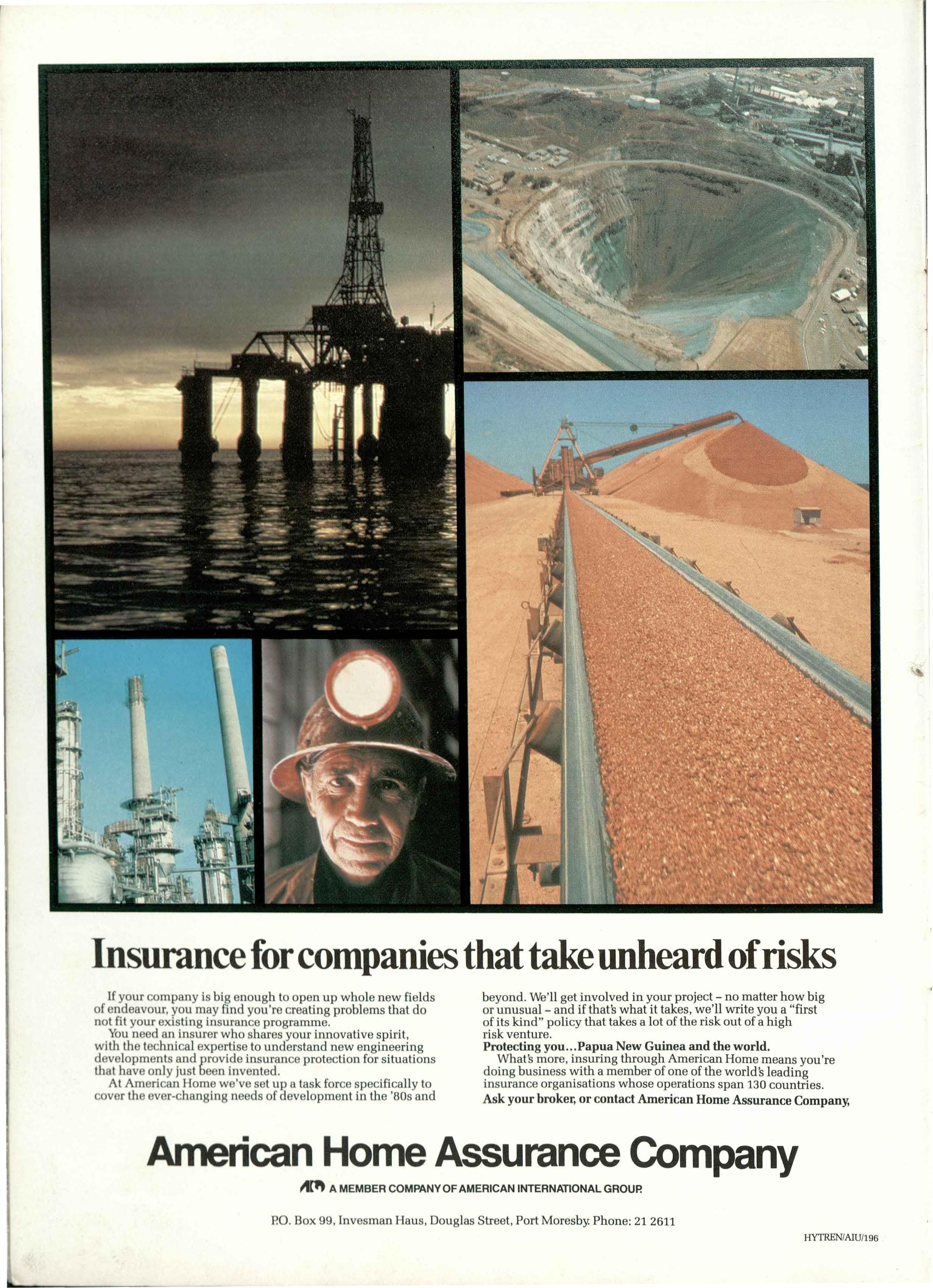 beyond. We'll get involved in your project - no matter how big or unusual - and if that's what it takes, we'll write you a "first of its kind" policy that takes a lot of the risk out of a high risk venture. Protecting you Papua New Guinea and the world. What'.smore, insuring through American Home means you're doing business with a member of one of the world's leading insurance organisations whose operations span 130 countries. Ask your broker, or contact American Home Assurance Company,