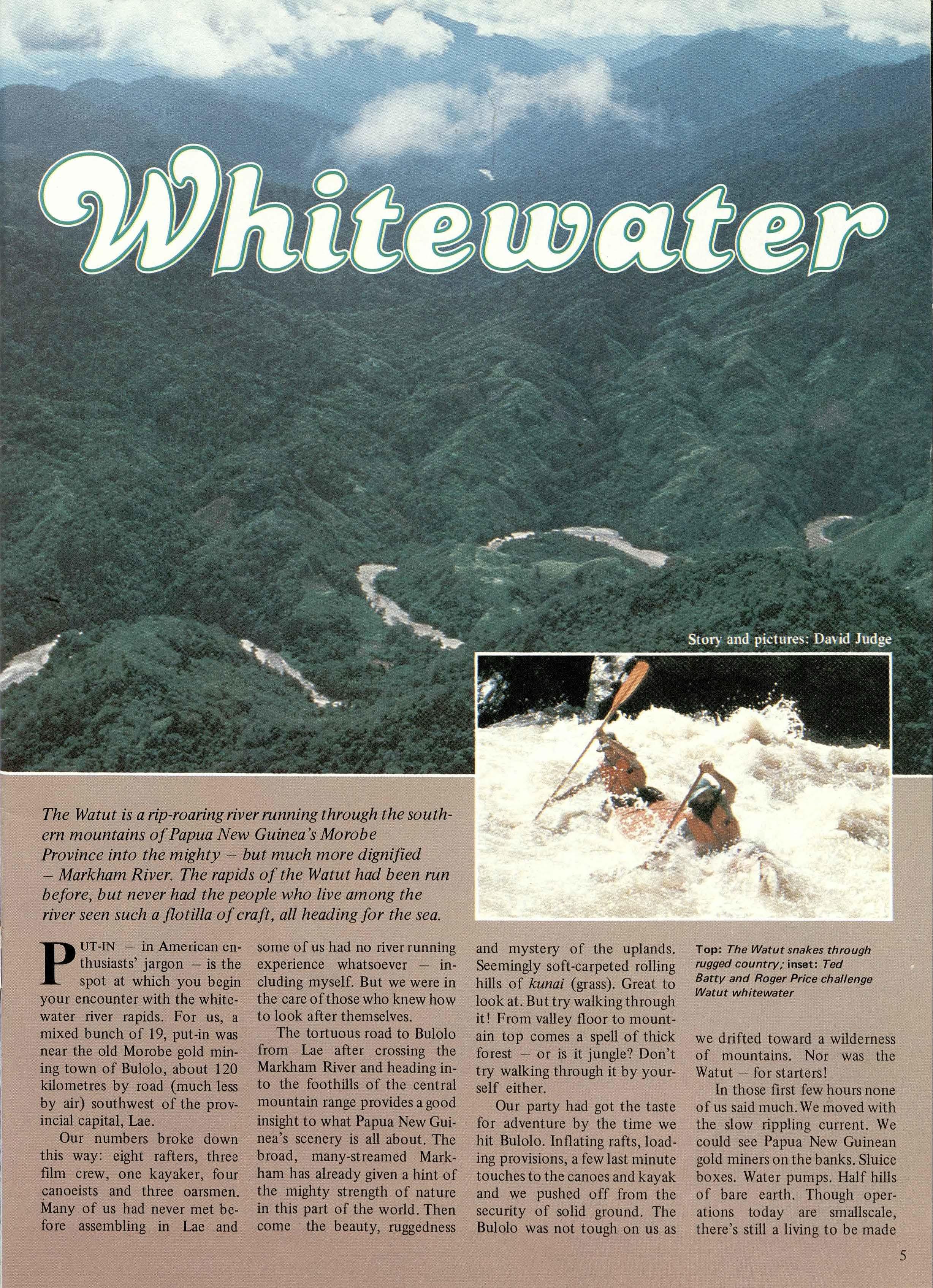The Watut is a rip-roaringriver running through the southern mountains of Papua New Guinea's Morobe Province into the mighty - but much more dignified - Markham River. The rapids of the Watut had been run before, but never had the people who live among the river seen such a flotilla of craft, all heading for the sea.