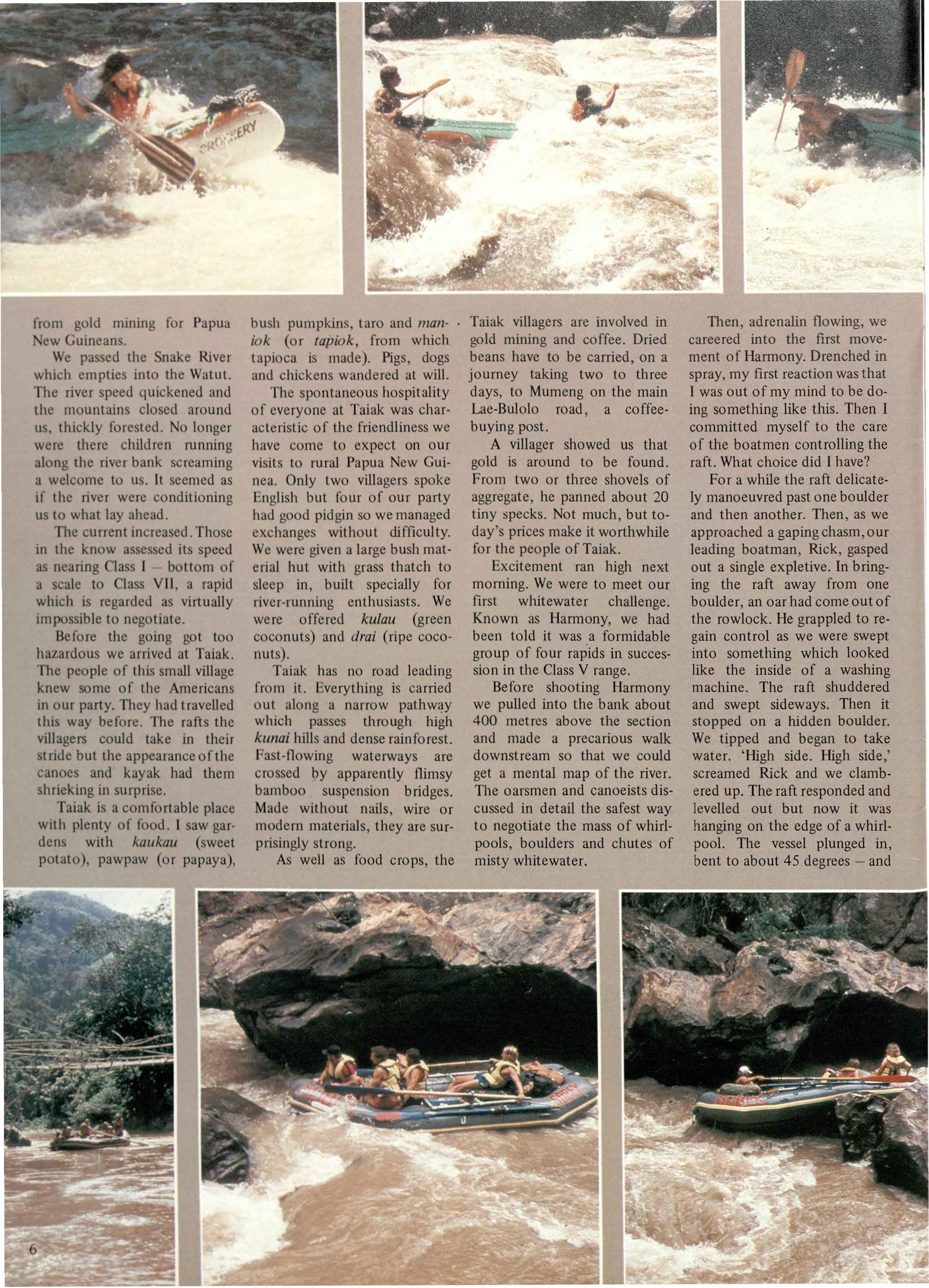 grassed hills. At Chias village the children gave us a rapturous welcome and the women showed off new babies. The men proudly displayed wild boars' jaws and empty wildfowl and cassowary eggs strung on lengths of vine around their houses. TI1eseensure good hunting, they said. Around noon on the eighth day we swept into the swiftly flowing· Markham and within an hour we were at its mouth, just west of Lae - 'pull-out' point. - David Judge is operations director of Papua New Guinea Explorations, Sydney, a division of Australian Himalayan Expeditions. The journey down the Watut was done in conjunction with SobekExpeditions of the United States.