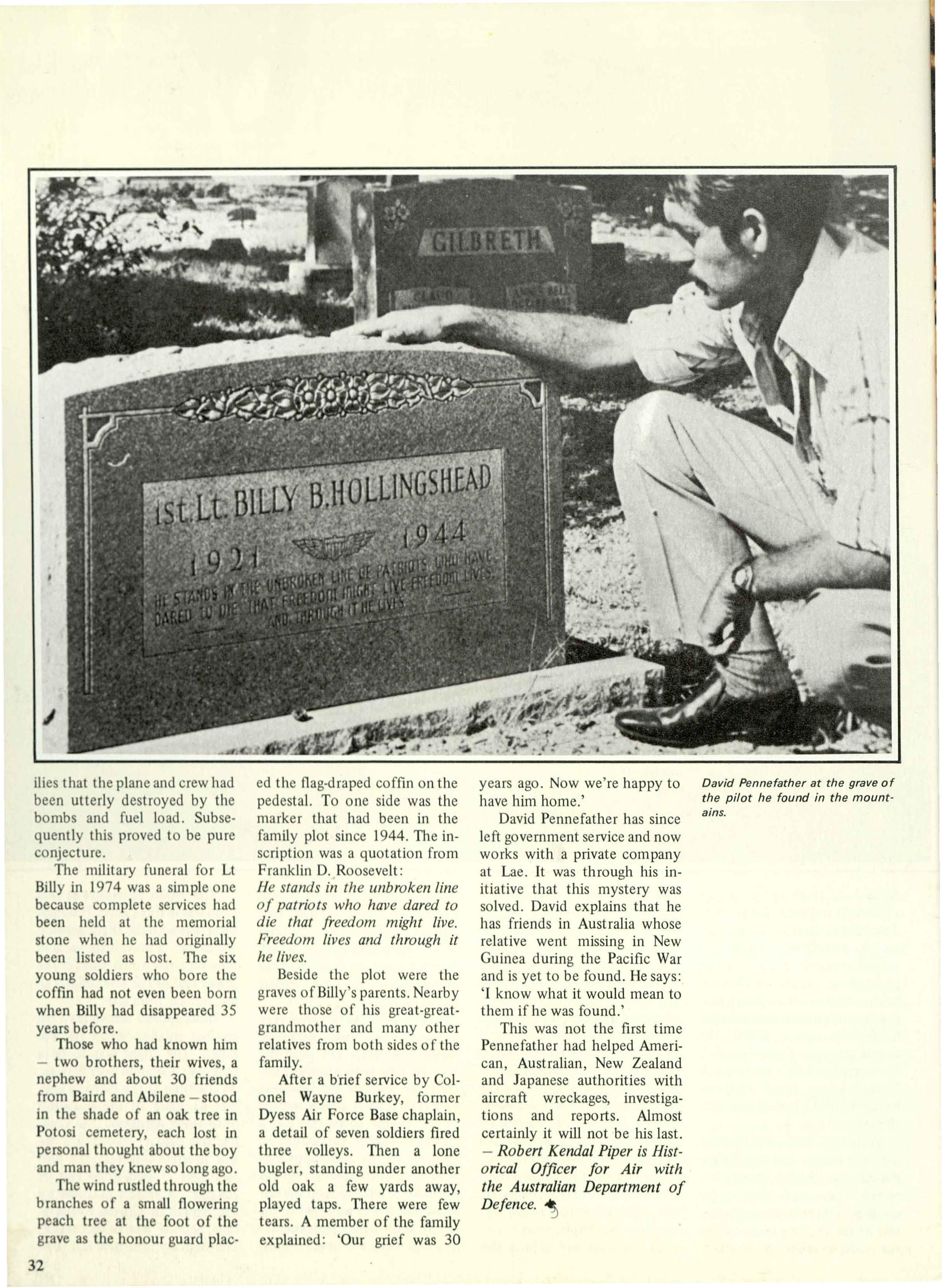 Details of the aircraft, pilot's name and the town from which he came were obtained by Pennefather from the Albert F. Simpson Historical Research Center (USAF) in the United States. Records listed the pilot as Lieutenant Billy B. Hollingshead of Baird, Texas. The gunner was identified as Staff Sergeant Leonard H. Tilder but there was nothing in the records to say where he came from.