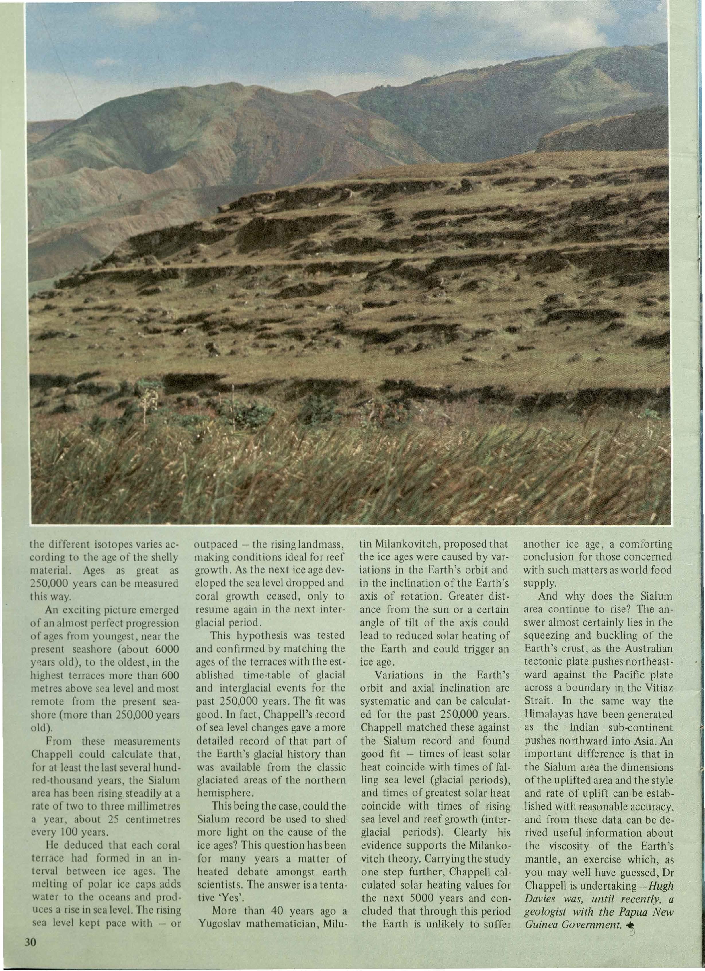 And why does the Sialum area continue to rise? The answer almost certainly lies in the squeezing and buckling of the Earth's crust, as the Australian tectonic plate pushes northeastward against the Pacific plate across a boundary in. the Vitiaz Strait. In the same way the Himalayas have been generated as the Indian sub-continent pushes northward into Asia. An important difference is that in the Sialum area the dimensions of the uplifted area and the style and rate of uplift can be established with reasonable accuracy, and from these data can be derived useful information about the viscosity of the Earth's mantle, an exercise which, as you may well have guessed, Dr Chappell is undertaking-Hugh Davies was, until recently, a geologist with the Papua New Guinea Government.