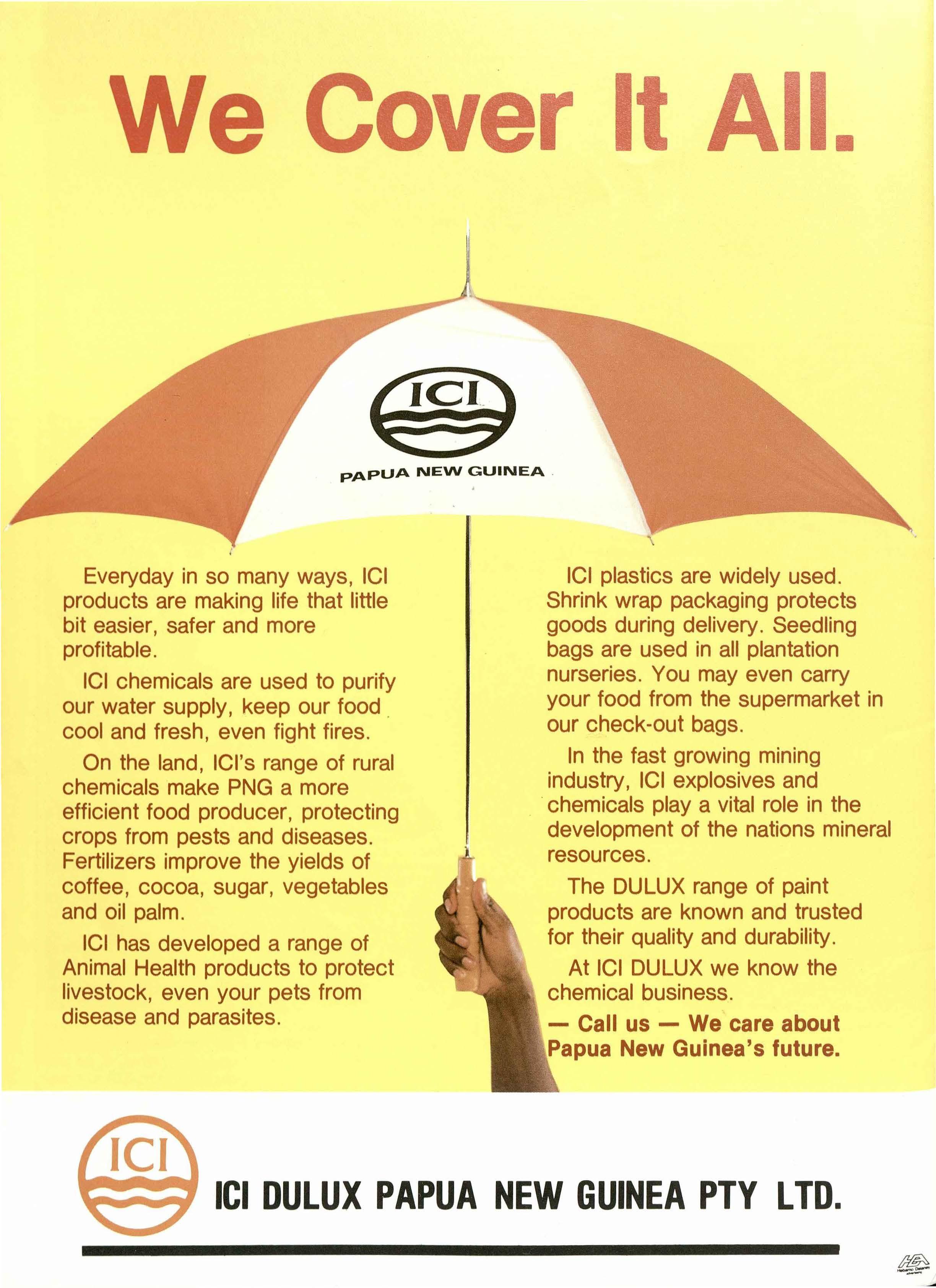 On the land, ICl's range of rural chemicals make PNG a more efficient food producer, protecting crops from pests and diseases. Fertilizers improve the yields of coffee, cocoa, sugar, vegetables and oil palm.