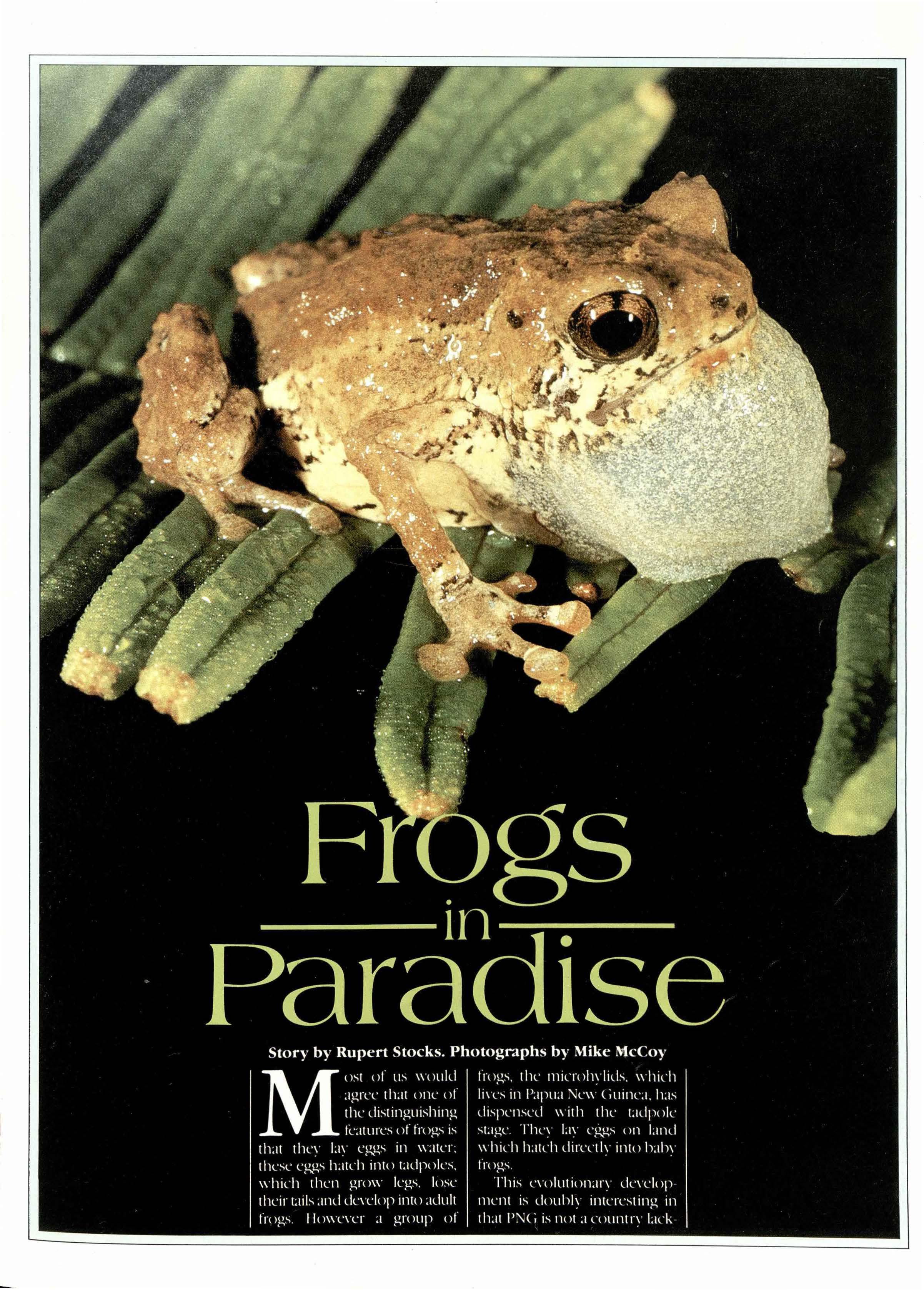 ome of these frogs are extremely abundant. For example Oreophryne sp., which can be found in shrubs and trees at night, is common in suburban gardens in Lae as well as the tropical rainforest. It is more often heard than seen and when I first heard the call, I described it as like a creaking hinge. It frequently calls from banana leaves and lays its eggs inside the stalk of a banana leaf near the main stem. The photograph (1)was obtained by prising the stalk from the main stem to reveal the frog and his eggs inside.