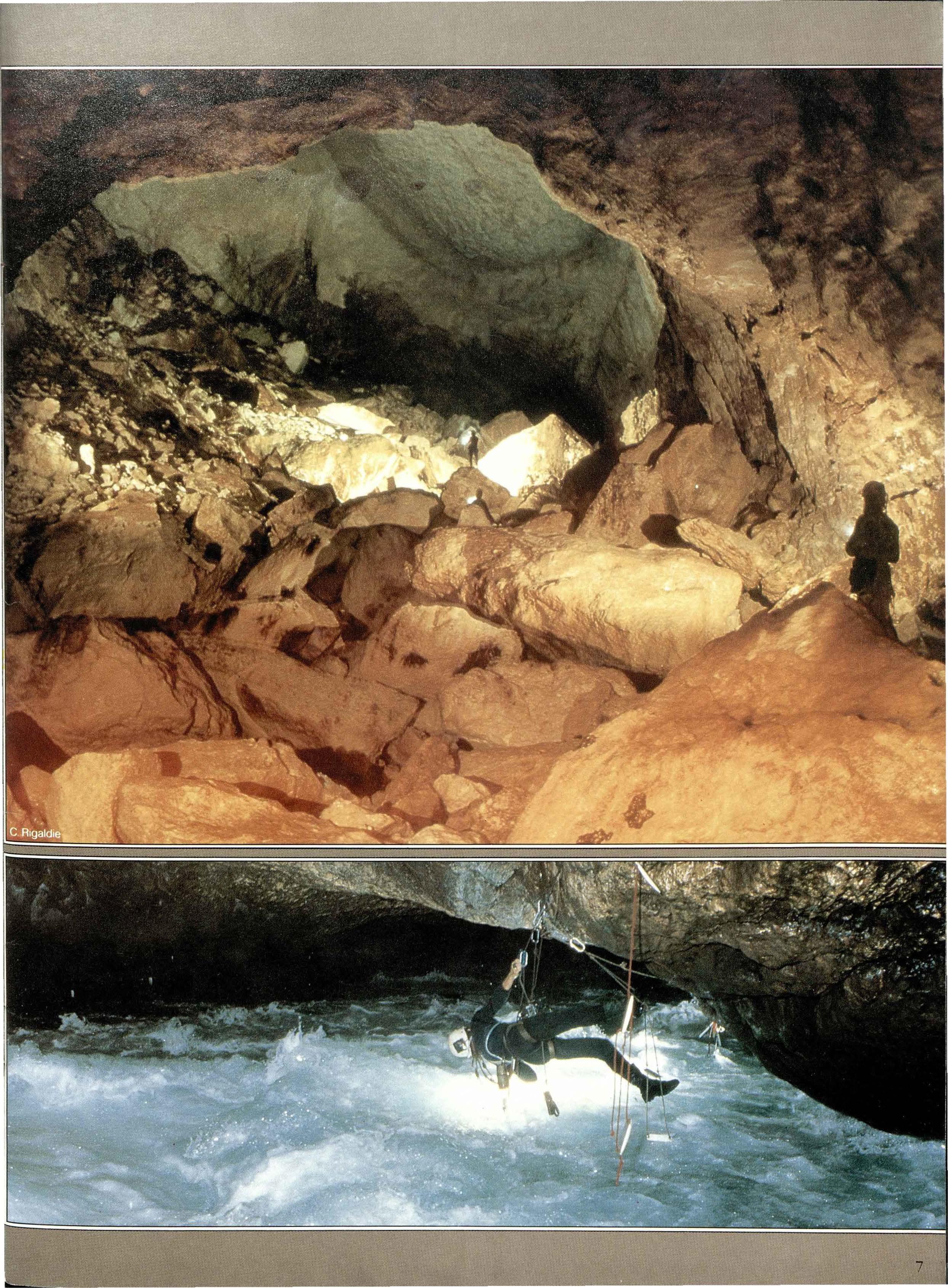 leaning over the water, discovers the gallery widens after the change of direction. The moral is obvious; 35 pitons and expansion bolts are necessary to overcome this giant roof above the infernal river.