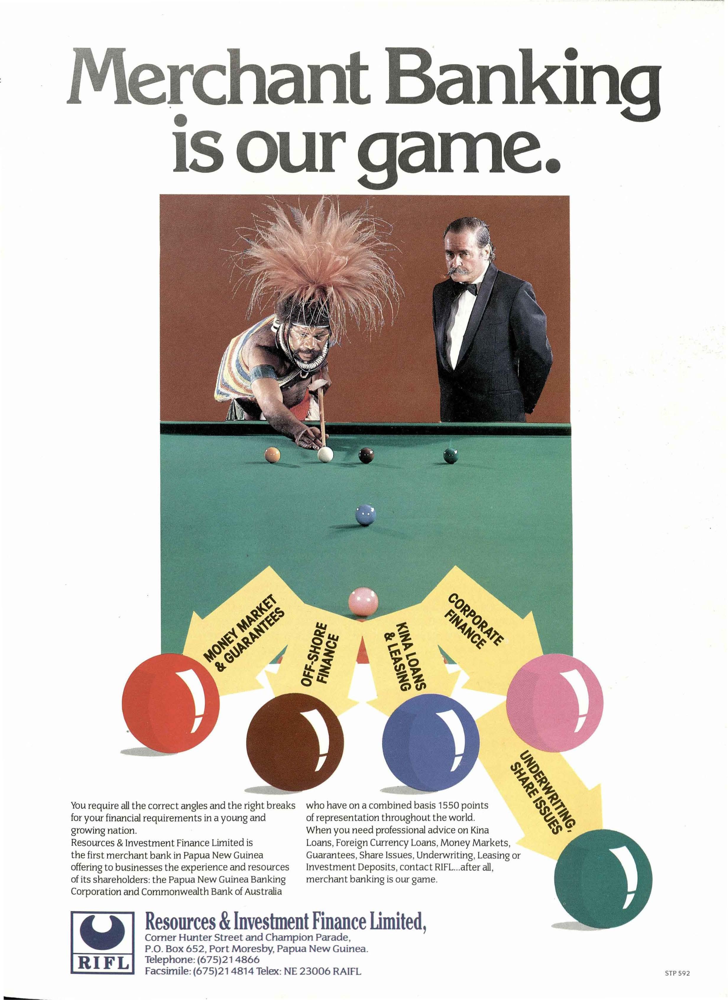 who have on a combined basis 1550 points of representation throughout the world. When you need professional advice on Kina Loans, Foreign Currency Loans, Money Markets, Guarantees, Share Issues, Underwriting, Leasing or Investment Deposits, contact RIFL...afterall, merchant banking is our game.
