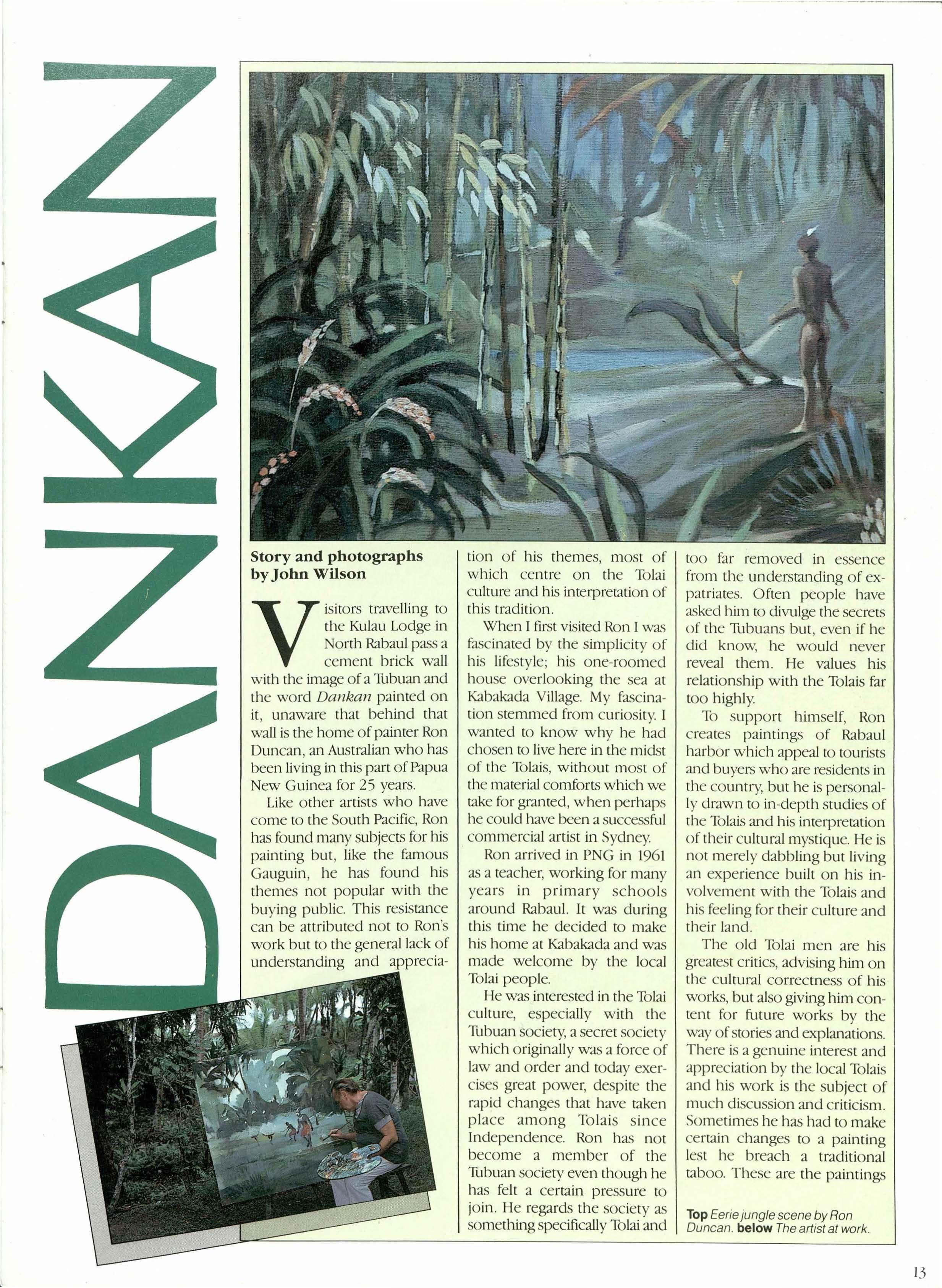 generally do not sell. Most buyers want moonlightover-the-harbor scenes and these Ron does in his individual style, but without interest because he feels they lack vitality and depth. It is in his treatment of traditional themes where he excels, where light, rhythm and the mystique of the Tolai culture is captured. Ron Duncan is in a unique position in that he is able to live quite compatibly with the Tolais and paint without pressure. He has given up material comforts for an existence which has been a valuable source of learning for him both as an artist and as a person. It is the Tolai people who anchor and encourage him. It is this rapport with the Tolai culture which he has experienced for these many years that has given his paintings life and meaning.