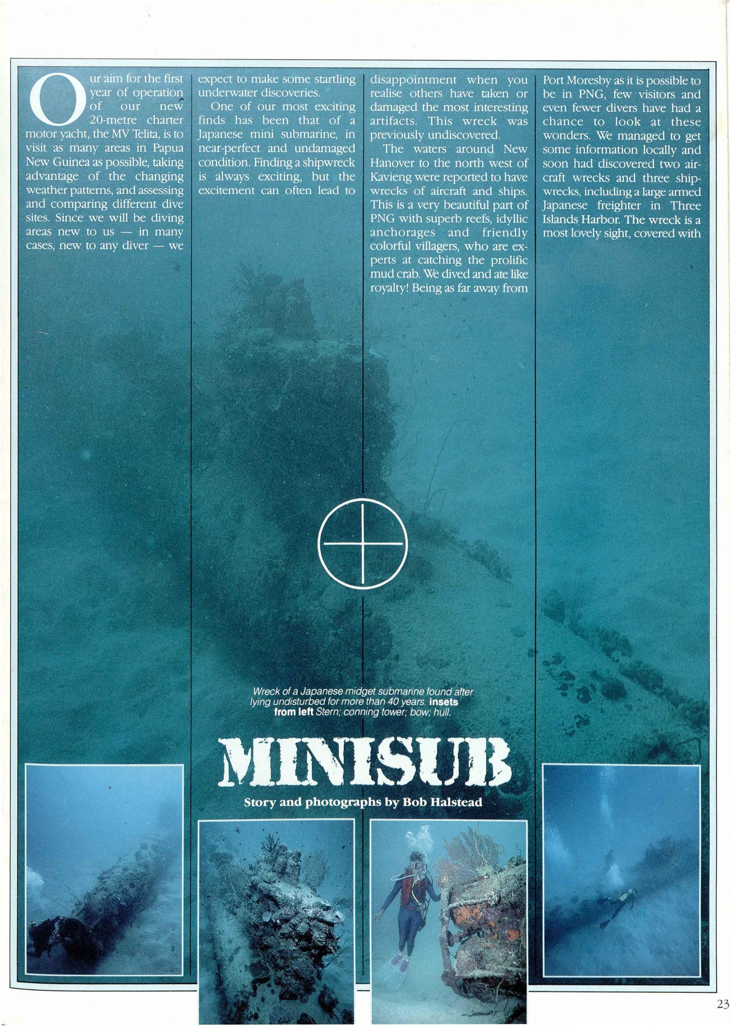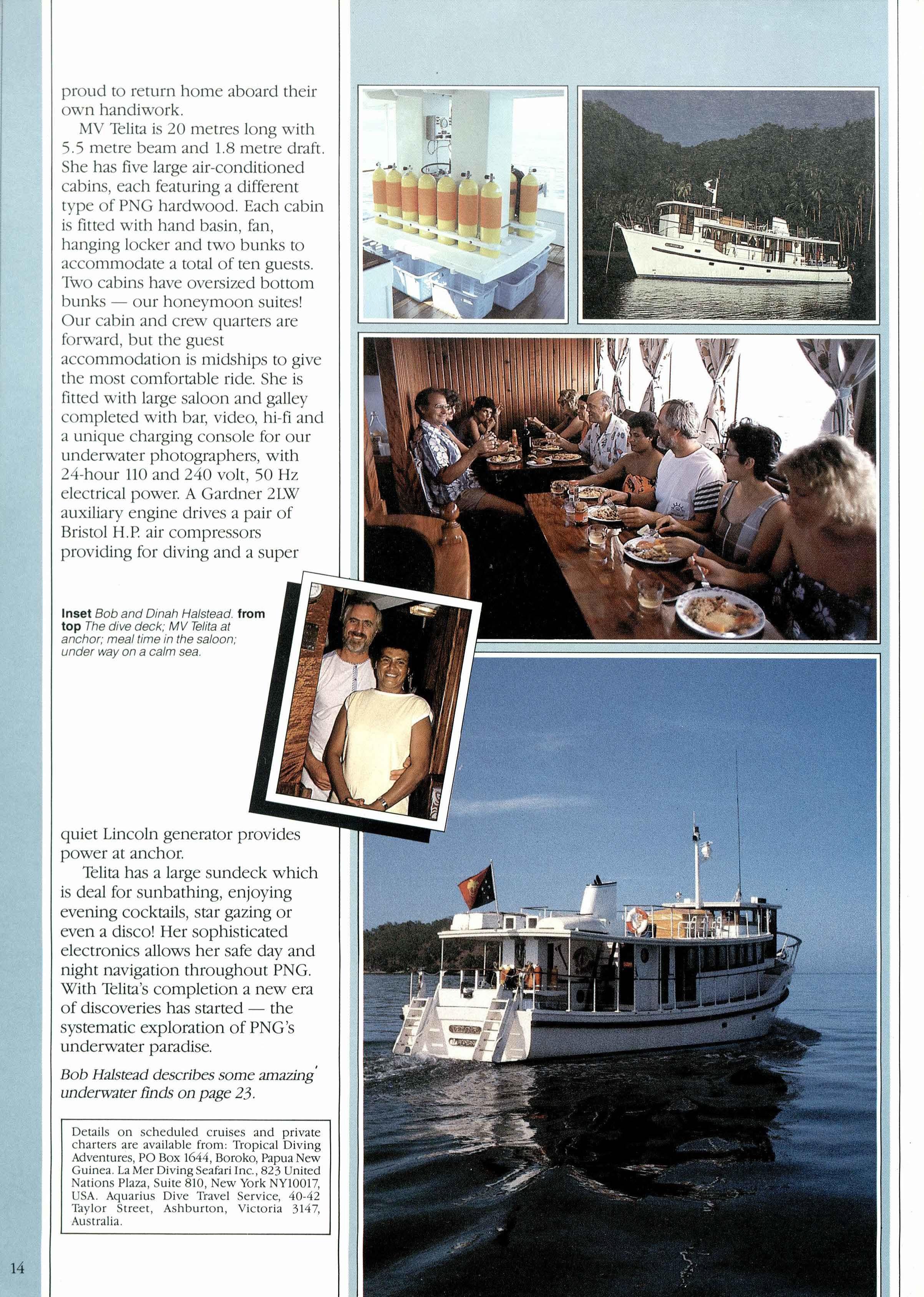 Recently a dream came true for Bob and Dinah Halstead with the entry into service of the MV Telita, their specialised charter dive boat built in PNG of PNG timbers. Bob and Dinah are divers who conduct tours throughout PNG waters for visiting •divers and the systematic exploration of our waters where startling discoveries are made similar to the recently sighted midget submarine off the New Ireland coast.