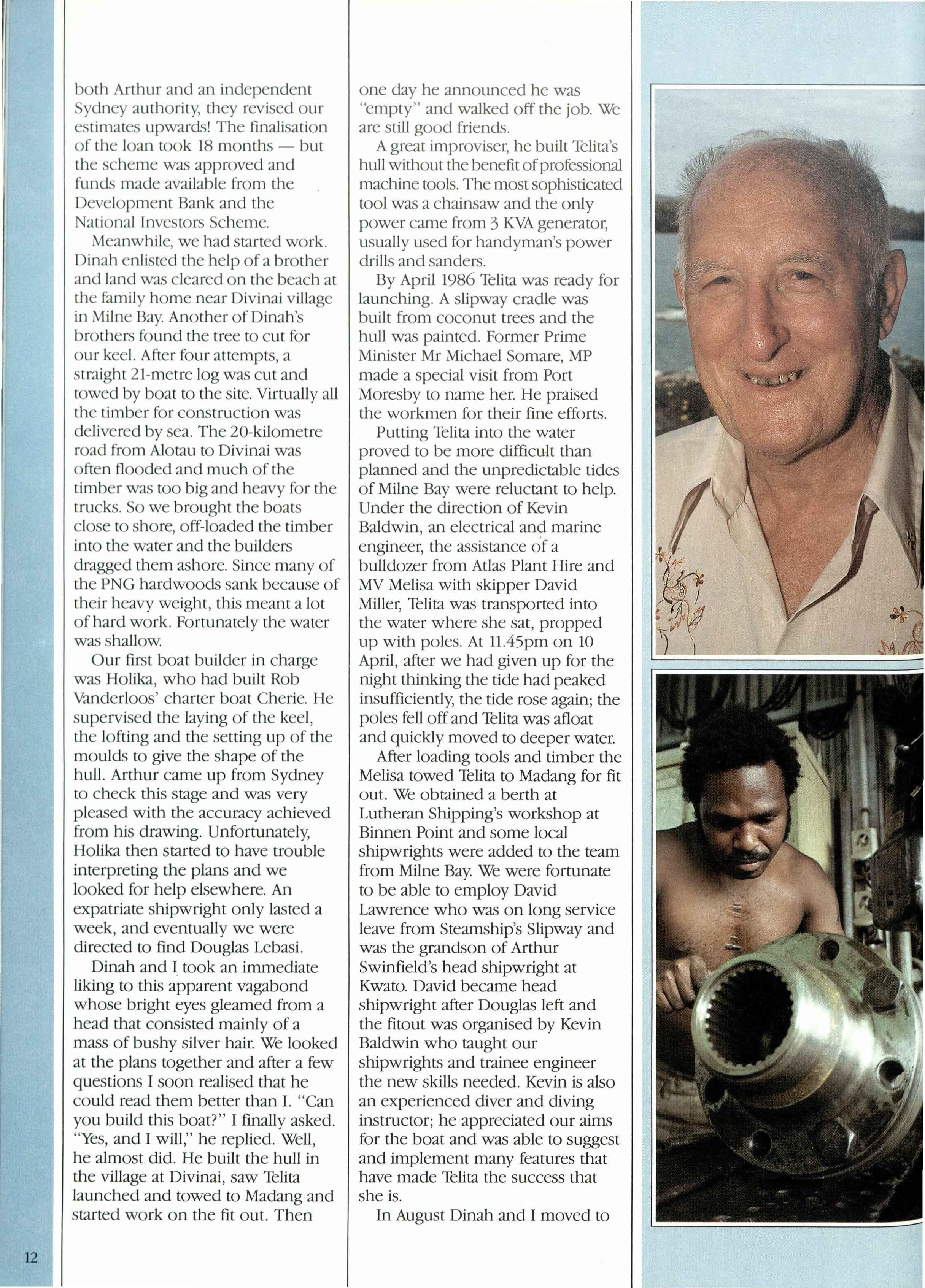 Top left Naval architect Arthur Swinfield who trained PNG's first shipwrights. other photos O/dandnew methods readied MV Telitafor its launching, seen at bottom right.